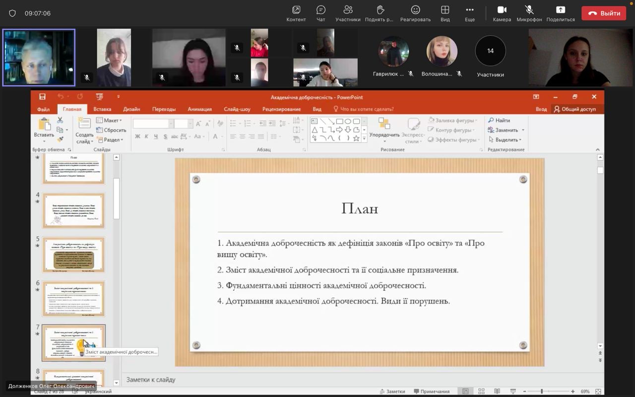 16 березня завідувач кафедри професор Долженков О.О. провів круглий стіл «Академічна доброчесність: виклики сучасності», на якому було розглянуто питання визначення та змісту академічної доброчесності, механізми виявлення фактів академічної недоброчесності, що діють в Університеті Ушинського, та відповідальності за них.