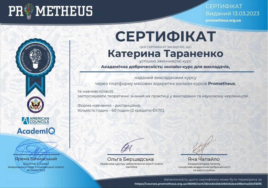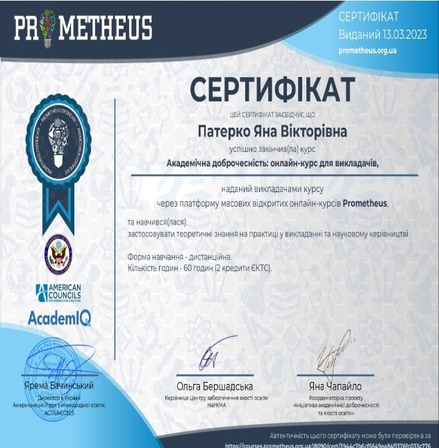 Протягом тижня студенти Расулова Вероніка (2 курс бакалаврату, спеціальність «Публічне управління та адміністрування»), Патерко Яна, Тараненко Катерина (1 курс магістратури, спеціальність «Менеджмент») пройшли онлайн-курс «Академічна доброчесність» на платформі Prometheus. Під час роботи на платформі студенти дізналися про теоретичні аспекти академічної доброчесності та чинники, що безпосередньо впливають на культуру академічної доброчесності здобувачів вищої освіти, а також навчилися застосовувати теоретичні знання на практиці. Було отримано відповідні сертифікати про проходження курсу.