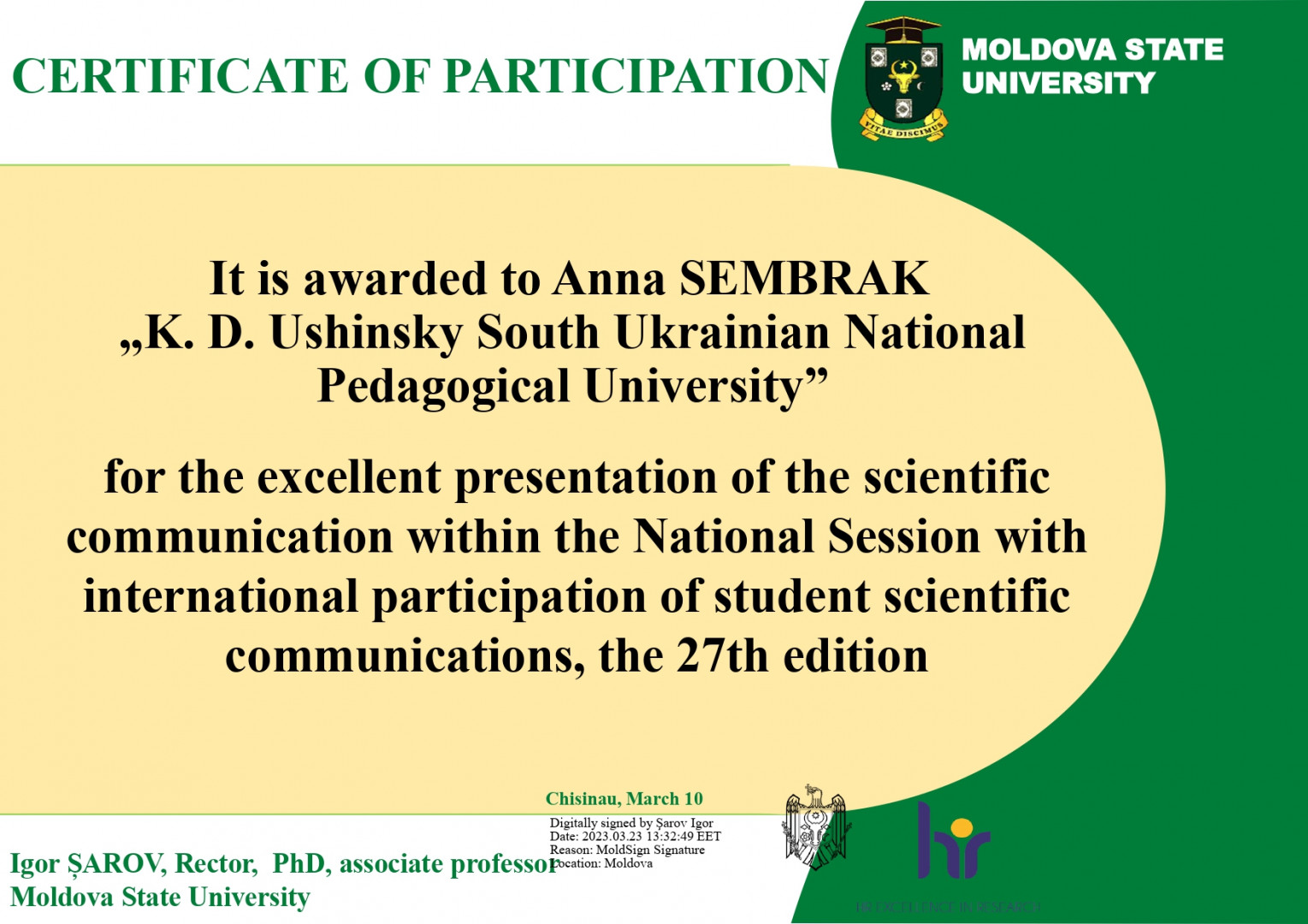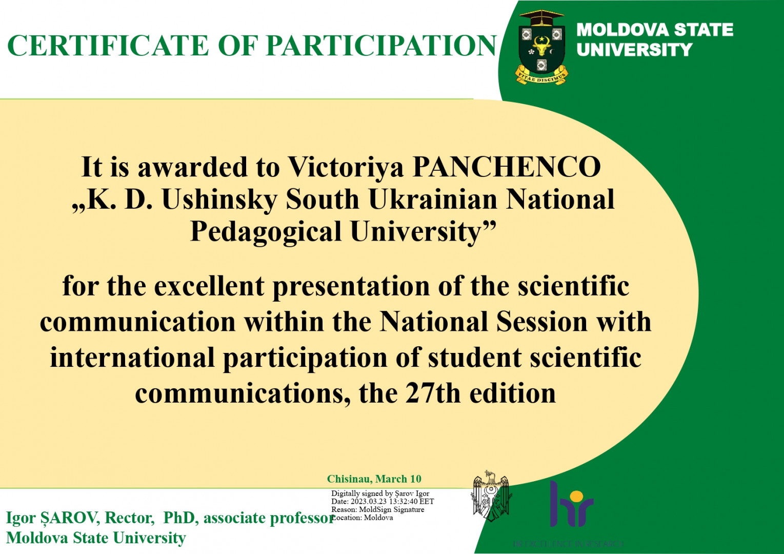 За результатами участі у Міжнародній науково-практичній конференції "National session with international participation of student scientific communications, 27th edition", яка відбулась у Moldova State University, здобувачі першого (бакалаврського) рівня вищої освіти 4 року денної форми навчання за спеціальністю 053 Психологія отримали сертифікати.