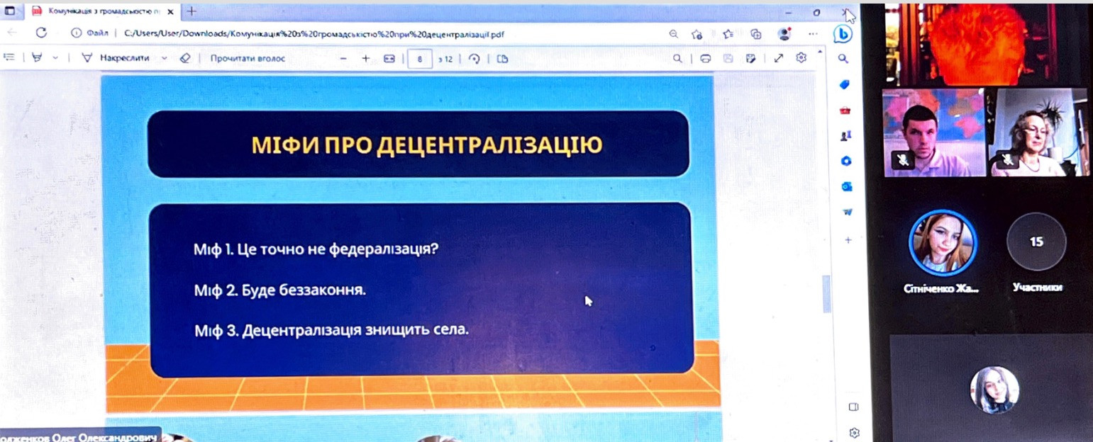 11 квітня 2023 року на кафедрі освітнього менеджменту та публічного управління в онлайн-режимі відбулося засідання наукового гуртка студентів бакалаврату спеціальності 281 «Публічне управління та адміністрування». Було детально обговорено важливу та актуальну тему – реформу децентралізації в Україні.