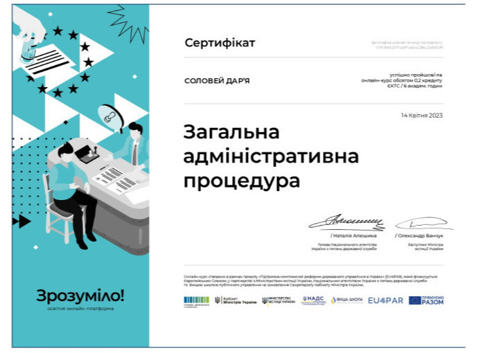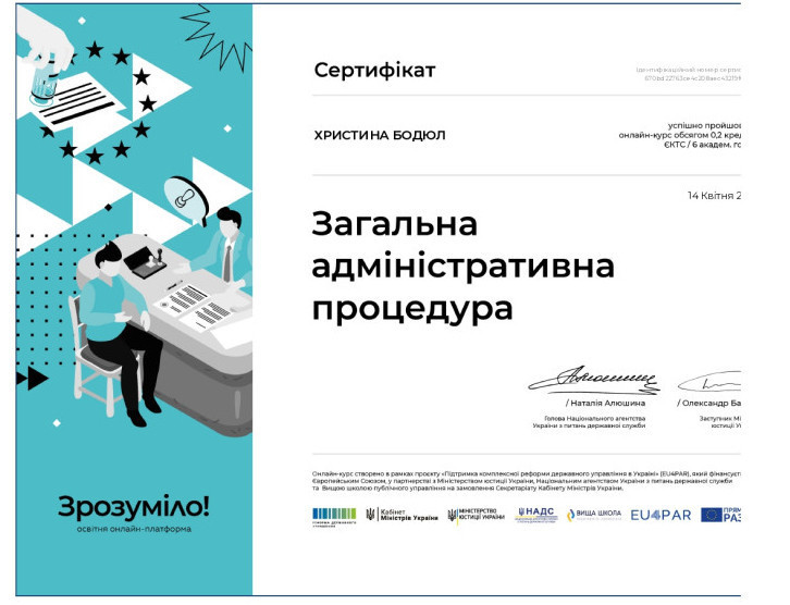 Успішно пройшли навчання та склали підсумкове тестування з теми «Загальна адміністративна процедура» 19 студентів 1-4 курсів: Бодюл Христина, Васильчук Тетяна, Веремчук Поліна, Волошина Діана, Гаврилюк Анастасія, Головко Назар, Голубенко Олександра, Кіцельман Катерина, Кюркчю Евеліна, Маряніна Елеонора, Мінескурт Крістіна, Некрасова Анастасія, Ніколаєва Дар’я, Расулова Вероніка, Сітніченко Жанна, Соловей Дар’я, Сологуб Анастасія, Сторожук Альона, Туневич Анастасія.