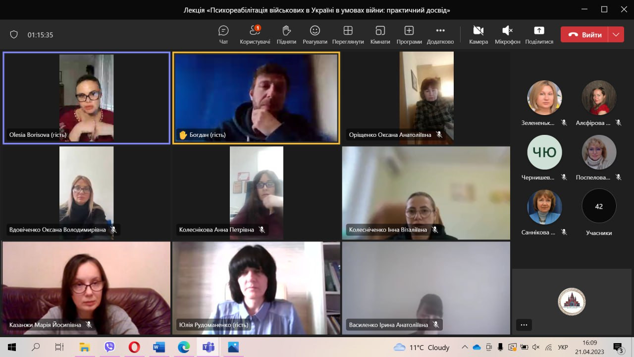 Так, аспірантка, практичний психолог Юлія РУДОМАНЕНКО провела тренінг «Конфлікти та шляхи їх вирішення»; аспірантка Юлія ВАТАН разом зі здобувачами Дар’єю МАРТИНЮК, магістранткою 1 курсу за спеціальністю 053 Психологія ОПП Психологія, Лідією СТОЯНОВОЮ, здобувачкою 2 курсу за спеціальністю 053 Психологія ОПП Психологія провели тренінг «Зняття психоемоційного напруження». Асистентом спікера Ірини МЕЛЬНИЧУК при проведенні майстер-класу «Профілактика психосоматичних захворювань у студентів під час військових дій» була аспірантка Олена ОНІЩЕНКО.
