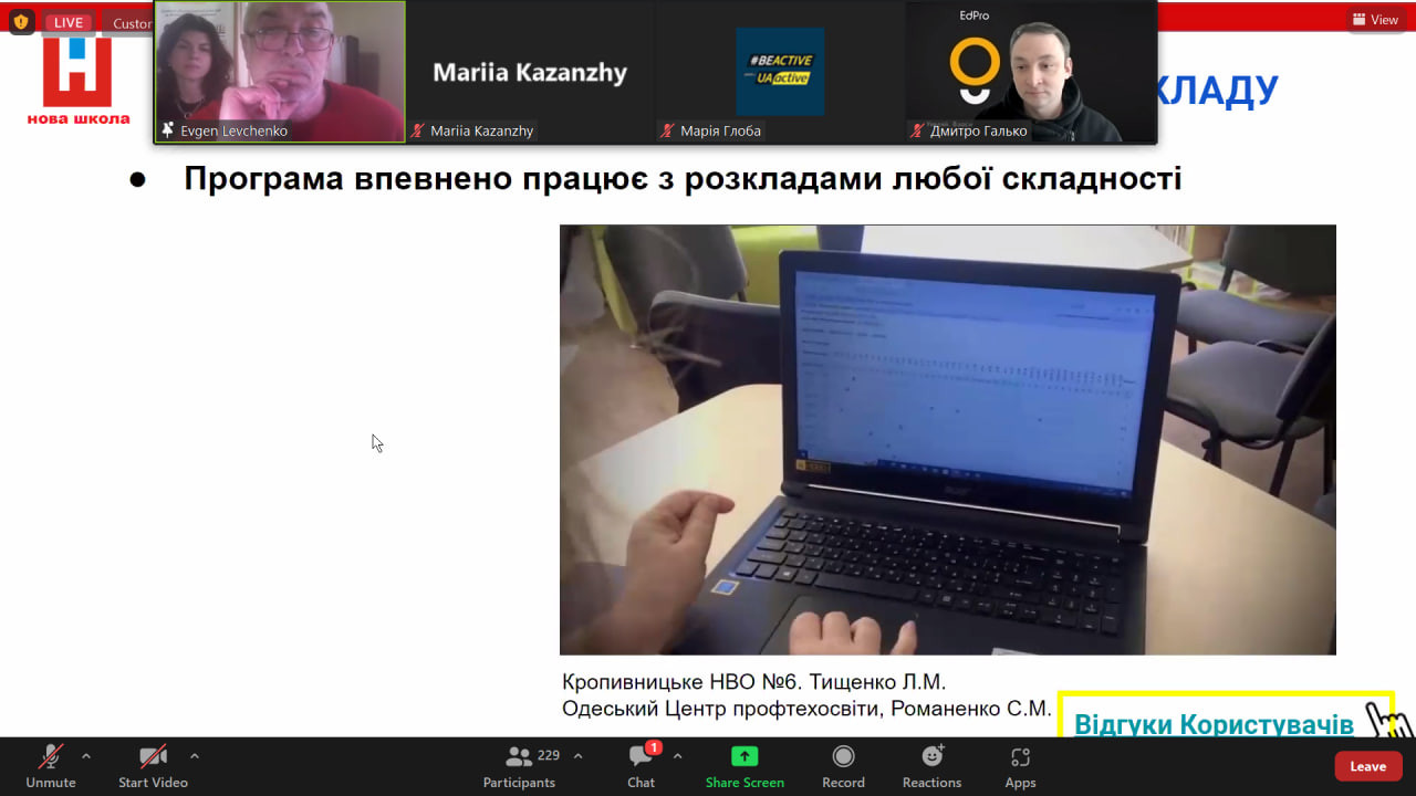 На заході, який відбувався на платформі Zoom, було розглянуто специфіку використання цифрових технологій у створенні електронного освітнього середовища закладу освіти. Описано та наведено приклади використання програм для вирішення певних прикладних завдань, як-то складання розкладу занять тощо.