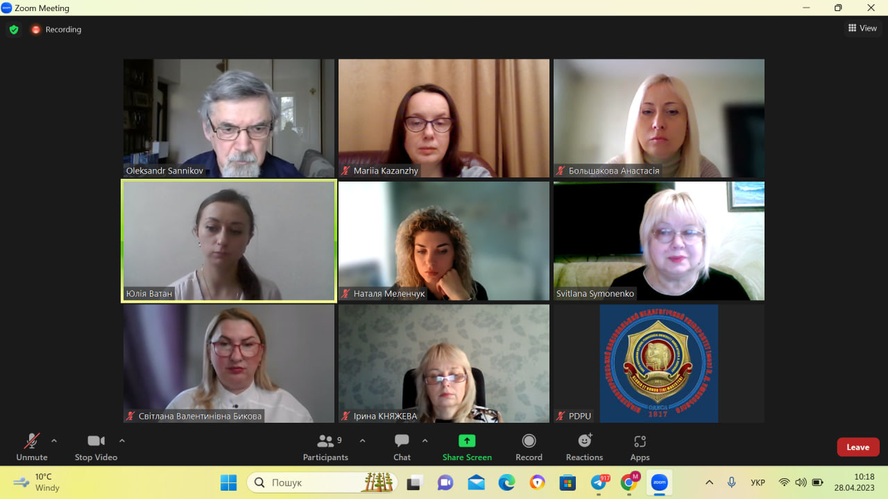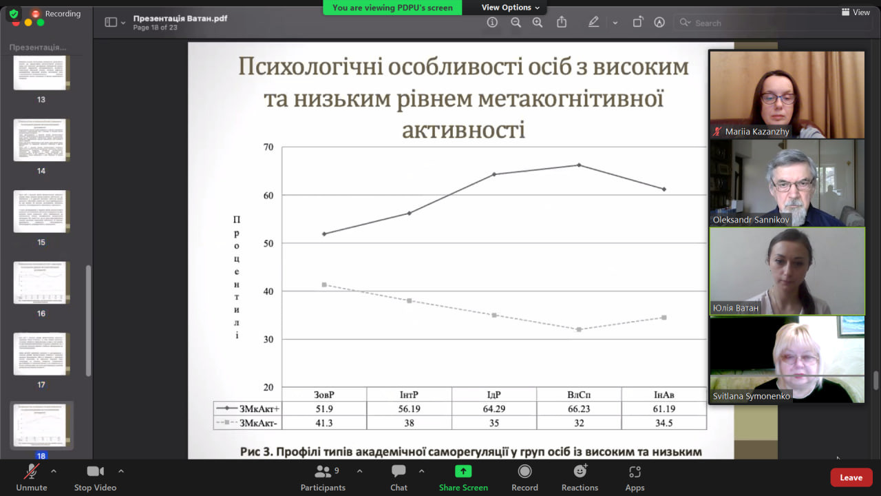 В Університеті Ушинського 28 квітня 2023 року на платформі Zoom відбувся успішний захист дисертації аспірантки Юлії ВАТАН з теми «Психологічні особливості актуалізації метакогнітивного потенціалу особистості» на здобуття наукового ступеня доктора філософії зі спеціальності 053 Психологія.