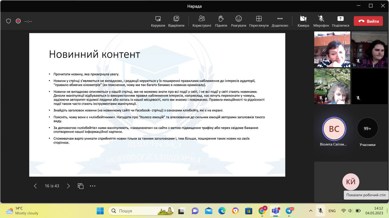 Спікером заходу виступила Людмила МАРЧУК, професор, завідувачка кафедри української мови Кам’янець-Подільського національного університету імені Івана Огієнка. Було розкрито історичний контекст інформаційних воєн; як встановити фейкового новин; як дотримуватися інформаційної гігієни. Було також розглянуто основні фейки повномасштабної російсько-української війни, як виявляти та розвінчувати дезінформацію та пропаганду тощо.