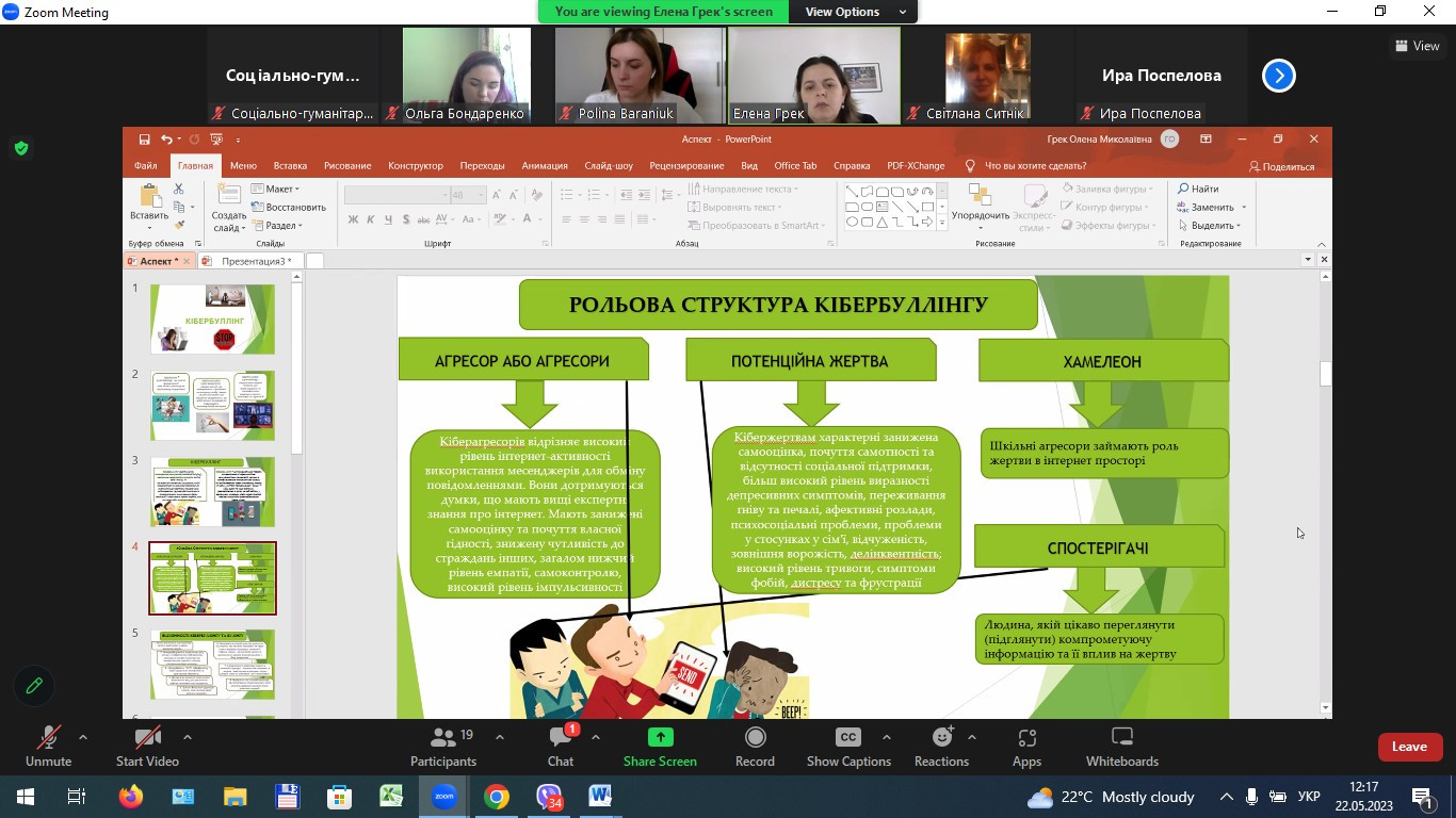 У форматі тренінгу Бондаренко Ольга Володимирівна (докторант Департаменту психології Moldova State University) та Грек Олена Миколаївна (доцент кафедри теорії та методики практичної психології соціально-гуманітарного факультету Університету Ушинського) відпрацювали практичні навички психологічної профілактики булінгу та кібербулінгу.