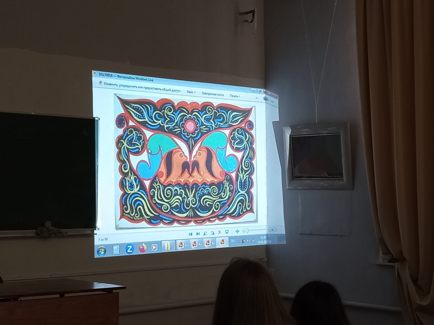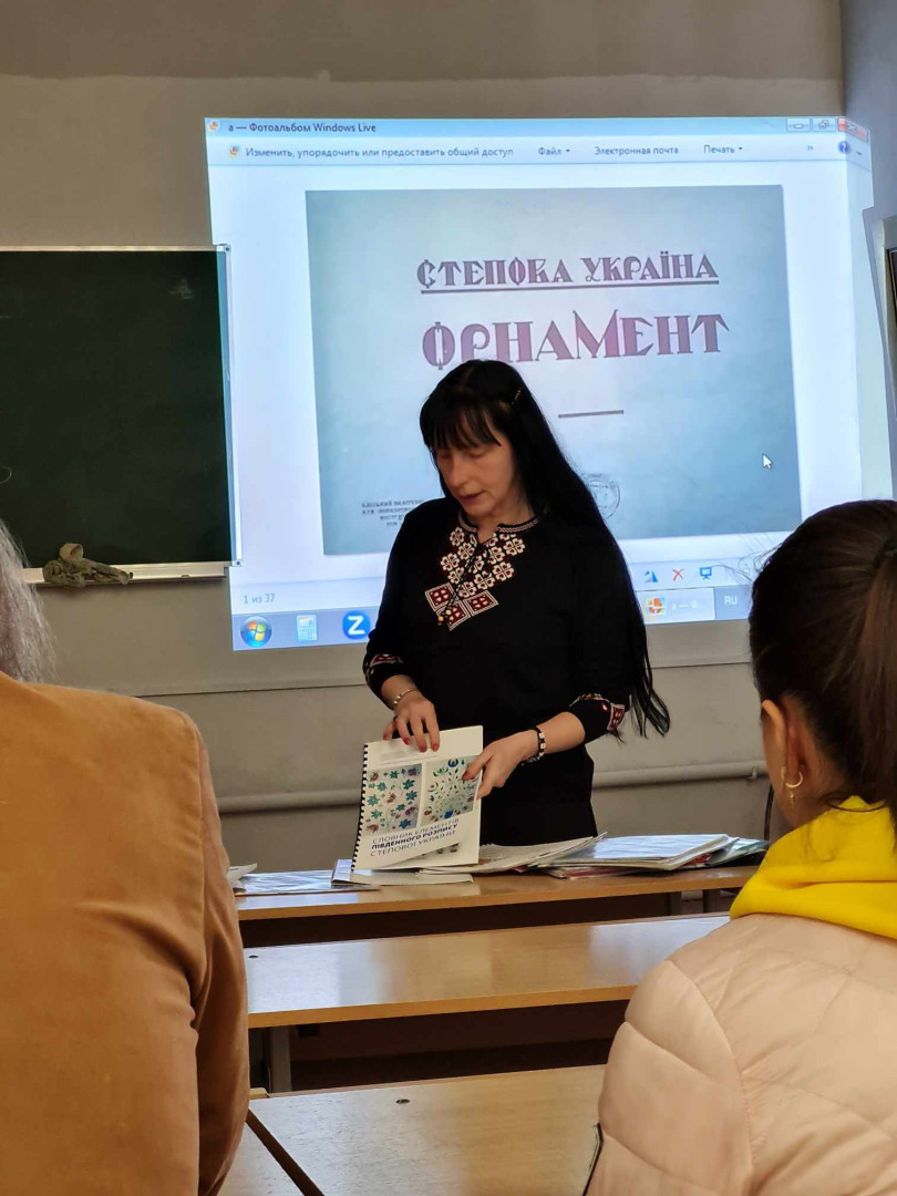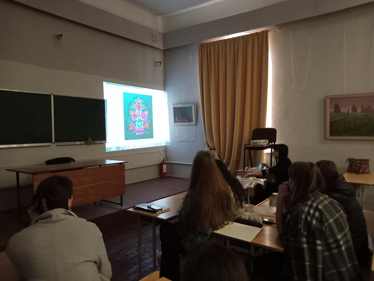 Тамара БІЛОГЛАЗОВА, провідний методист Одеського обласного центру української культури познайомила студентів з витоками традиційного народного мистецтва, степовими мотивами розписів, символікою рослинних орнаментів та орнаментальних композиційних схем, характерною колористикою.