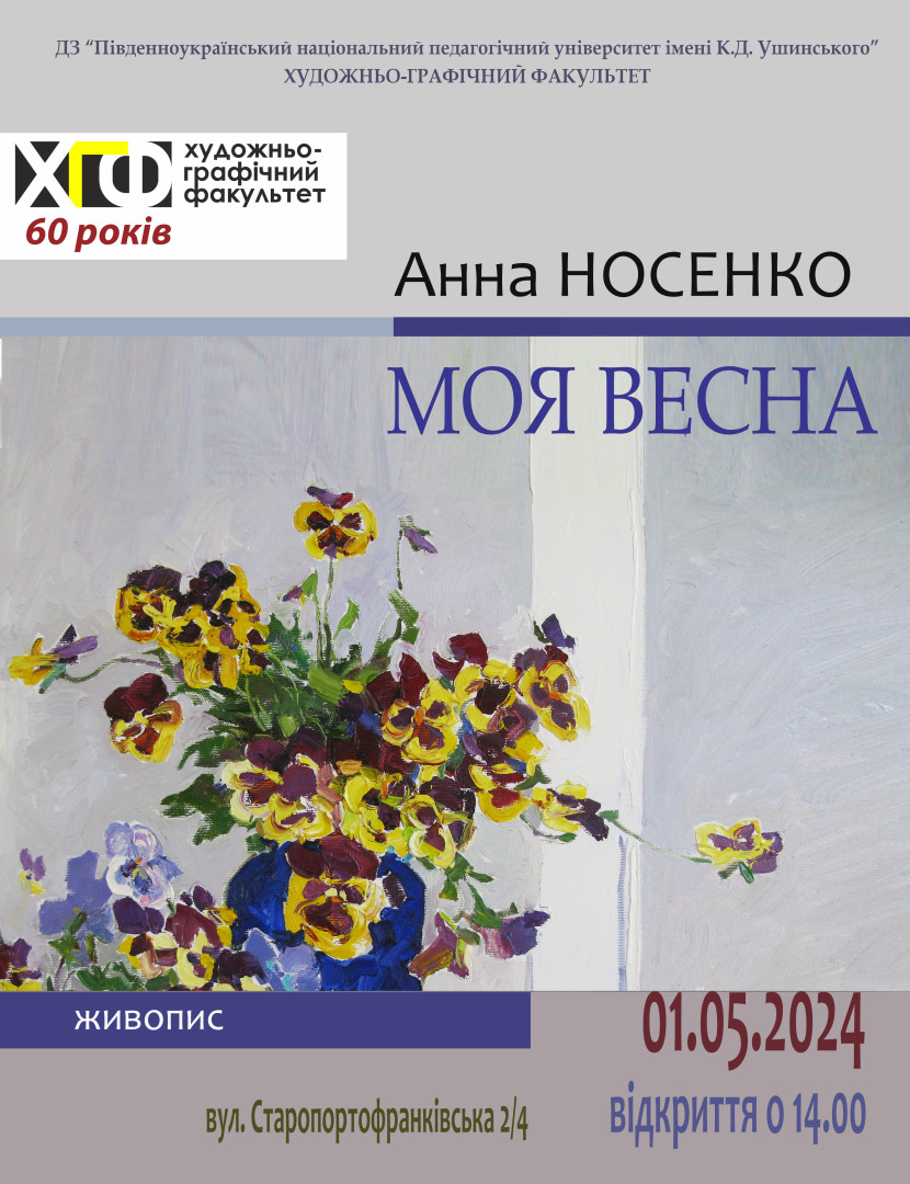 1 травня 2024 року у виставковому просторі фойє художньо-графічного факультету була відкрита виставка живопису завідувача кафедри образотворчого мистецтва Анни Носенко.