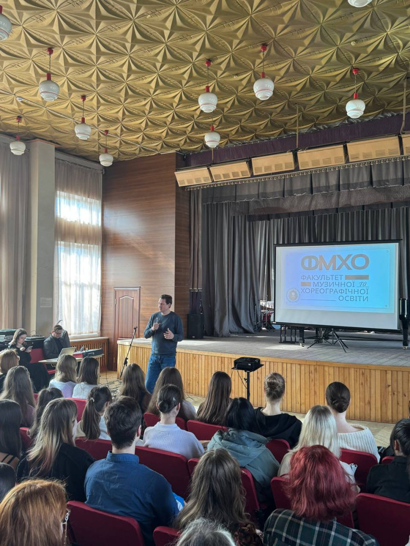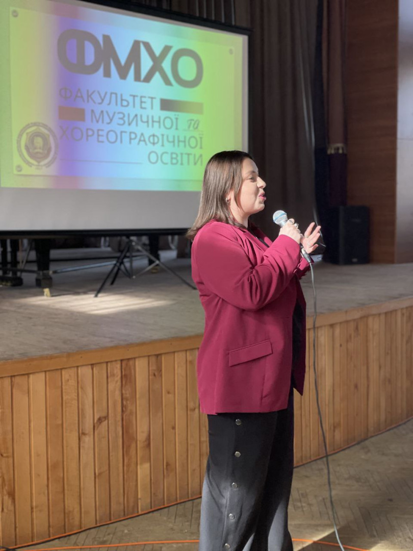 Декан факультету музичної та хореографічної освіти Олена Новська ознайомила присутніх із спеціальностями, напрямами підготовки, особливостями освітнього процесу та умовами вступної кампанії. Особливу увагу було приділено можливостям побудови індивідуальних освітніх траєкторій, що дозволяють студентам максимально розкрити свій творчий потенціал та отримати комплексну професійну підготовку.