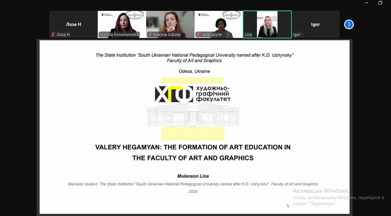 7 березня 2025 року в контексті нових вимог до освіти, пов’язаних з європейською інтеграцією України, ДЗ «Південноукраїнський національний педагогічний університет імені К.Д. Ушинського» ХГФ - Університет Ушинського Університет Ушинського м. Одеса взяв участь як партнер в Міжнародній науково-практичній онлайн-конференції «ЄВРОІНТЕГРАЦІЯ В МИСТЕЦТВІ, НАУЦІ ТА ОСВІТІ: ДОСВІД, ПЕРСПЕКТИВИ РОЗВИТКУ», яка відбулась в Клайпедському Університеті (Литва).