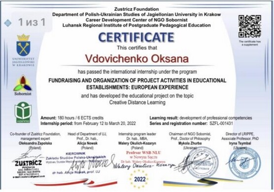 Міжнародне наукове стажування «Фандрейзинг та організація проєктної діяльності в закладах освіти: європейський досвід» (Польща – Україна), організаторами якого були: фундація «Зустріч» (Польща), кафедра Польсько-Українських Студій Ягеллонського університету (Польща), громадська організація «Соборність» (Україна), Луганський обласний інститут післядипломної педагогічної освіти (Україна) завершилось. Вітаємо викладачів, наукових керівників та аспірантів з успішним завершенням стажування та отриманням сертифікатів!