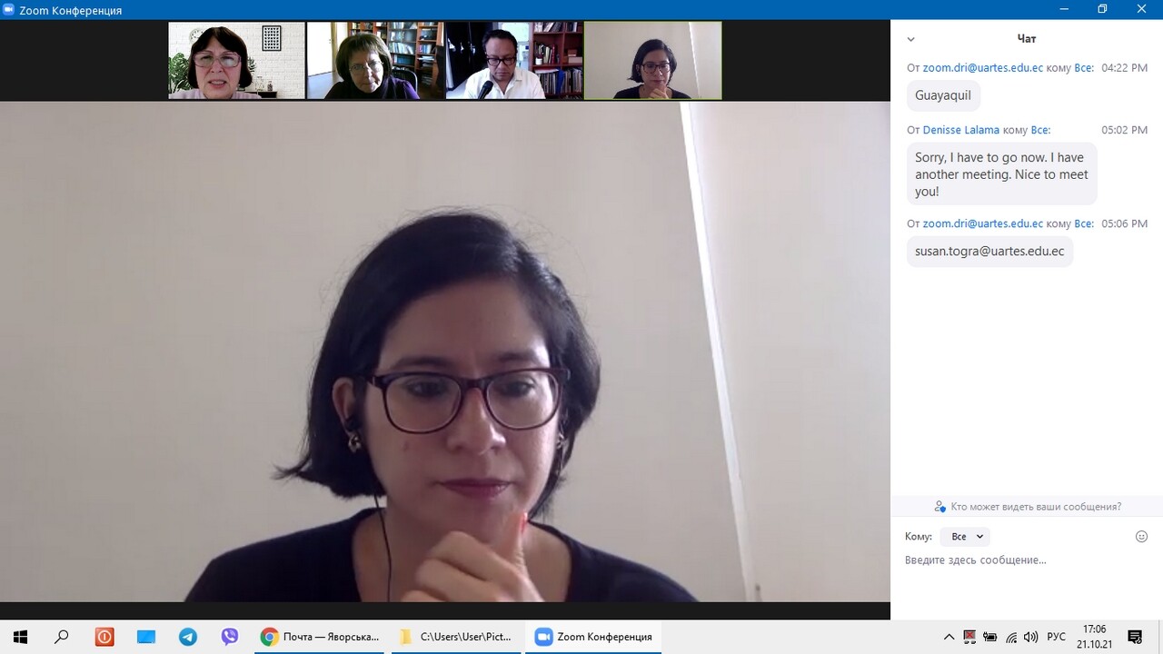 Наші випускники у Південній Америці сприяють розвитку відносини нашого університету з іноземними закладами вищої освіти. 21 жовтня 2021 року відбулася плідна онлайн зустріч представників нашого університету і Державного Університету Мистецтв Еквадору у місті Гуаякіль. У зустрічі приймали участь: з боку Університету Ушинського – декан Факультету музичної та хореографічної освіти Н.К. Білова, та провідний фахівець Відділу міжнародних зв’язків Л.П. Яворська; з боку Державного Університету Мистецтв Еквадору – декан Факультету звукового мистецтва Андрій Міхаїл Астаїза та проректор з міжнародних відносин Сьюзан Тогра Діас.