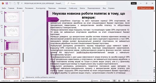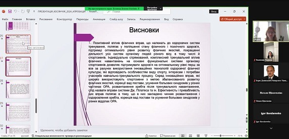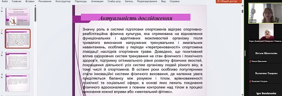 12 березня 2024 року відбулась презентація й обговорення дисертаційного дослідження на здобуття наукового ступеня доктора філософії зі спеціальності 017 Фізична культура і спорт аспірантки кафедри гімнастики та спортивних єдиноборств Оксани Косянчук з теми «Ефективність використання вправ пілатесу як засобу корекції опорно рухового апарату спортсменів після тренувальних навантажень (на матеріалі спортивної аеробіки)», науковий керівник – доктор наук з фізичного виховання та спорту, професор, професор кафедри гімнастики та спортивних єдиноборств Тодорова Валентина.