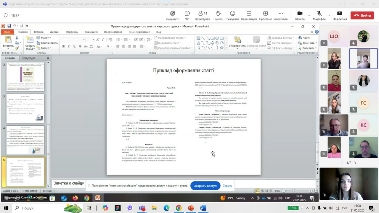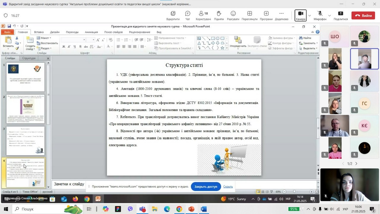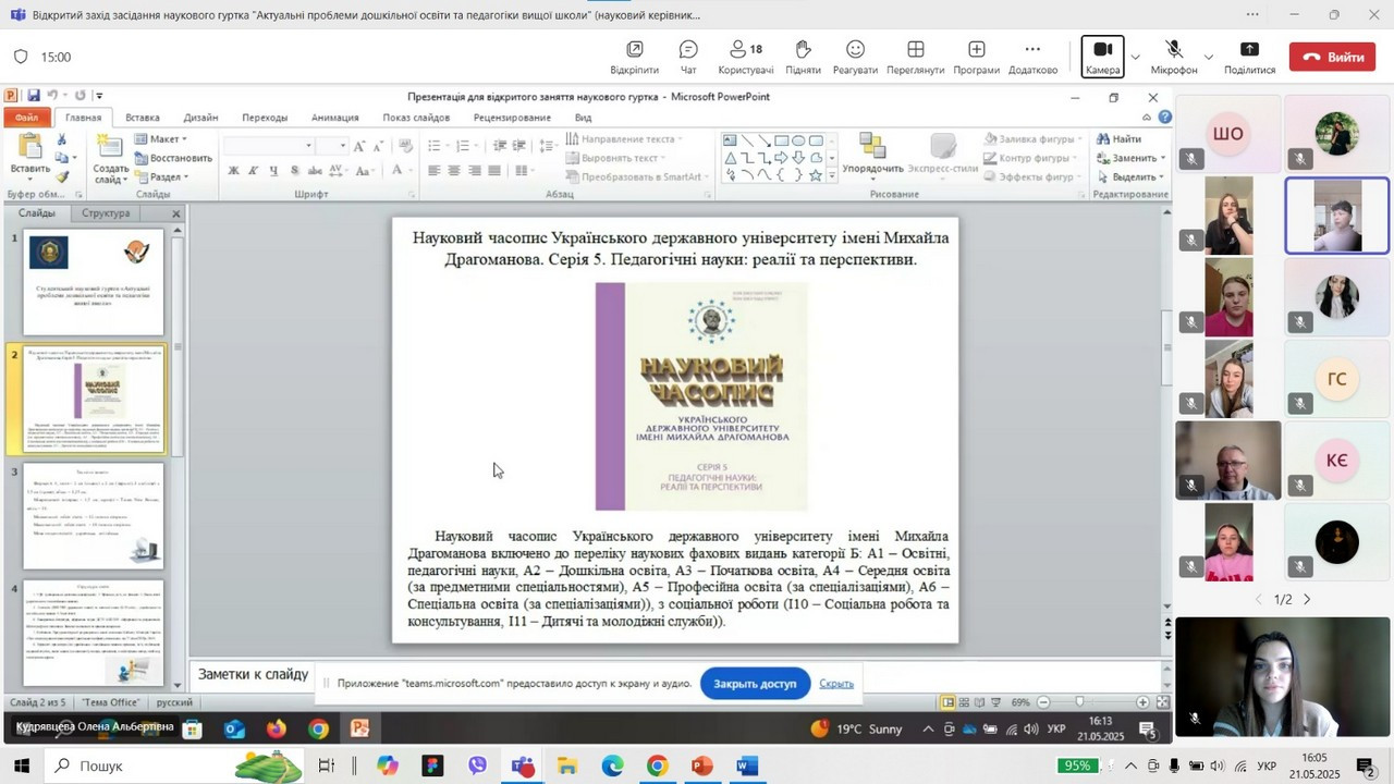 21 травня 2025 року в межах конкурсу на кращий науковий гурток в Університеті Ушинського відбулося онлайн-засідання студентського наукового гуртка «Актуальні проблеми дошкільної освіти та педагогіки вищої школи» кафедри дошкільної педагогіки. Захід пройшов на платформі Teams та зібрав активних учасників студентської наукової спільноти, конкурсну комісію та зацікавлених студентів – майбутніх членів гуртка.