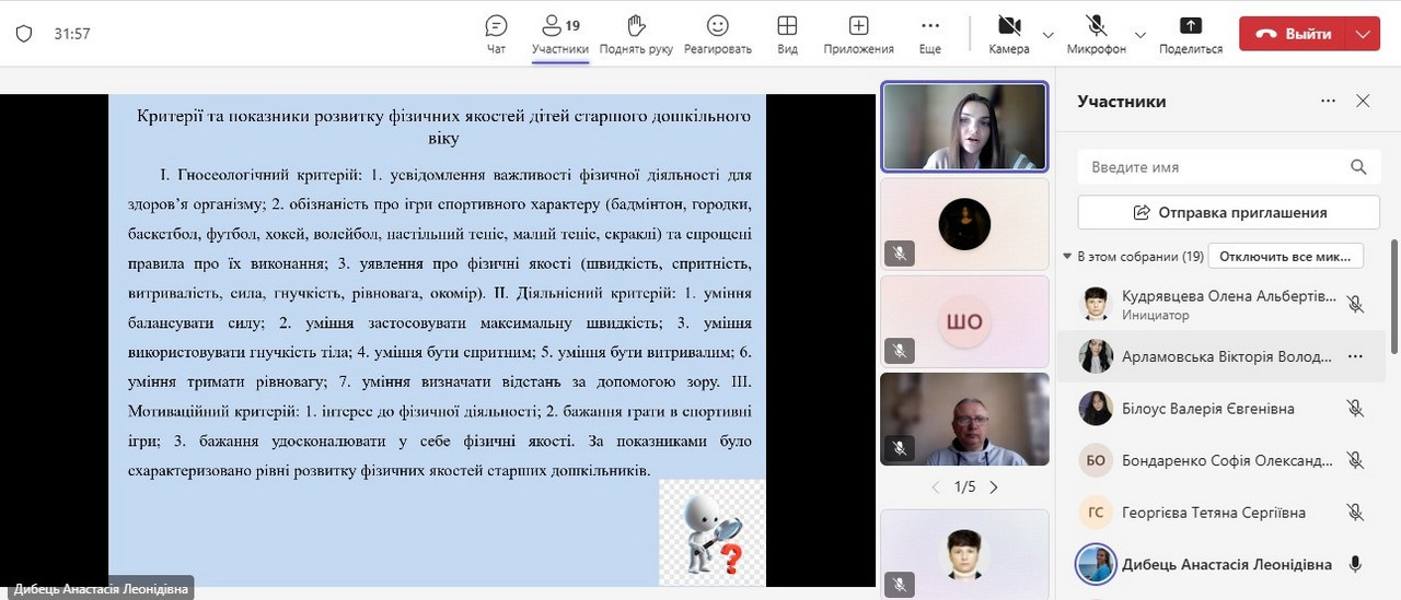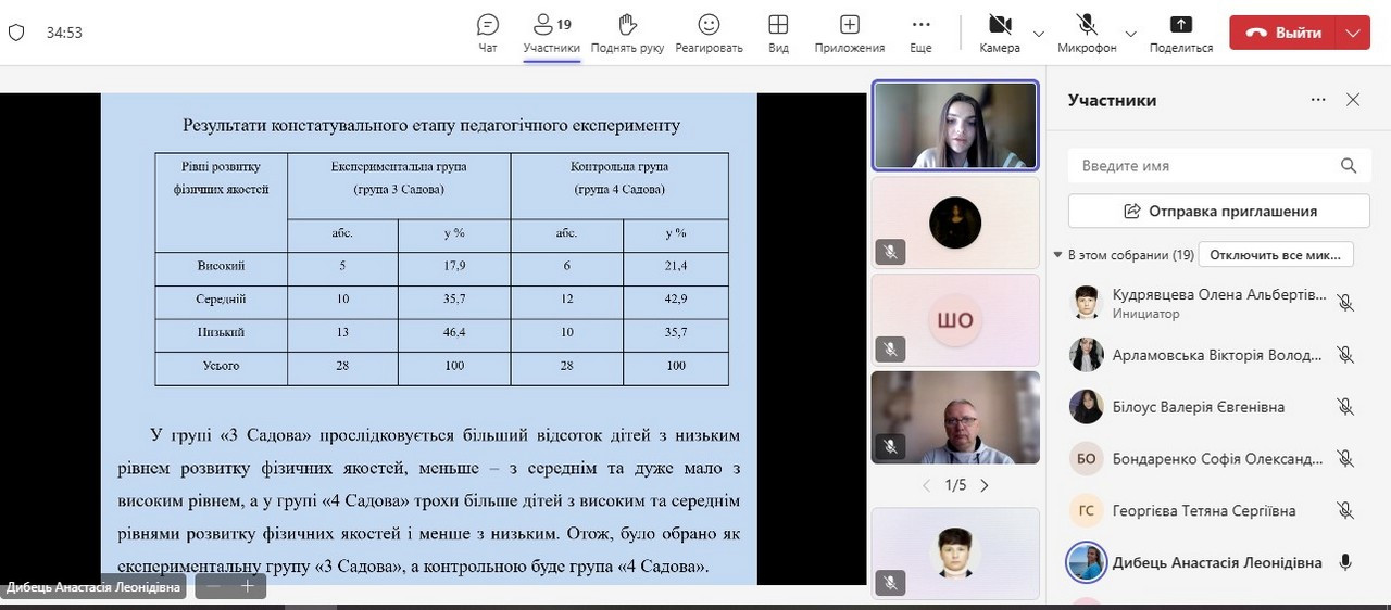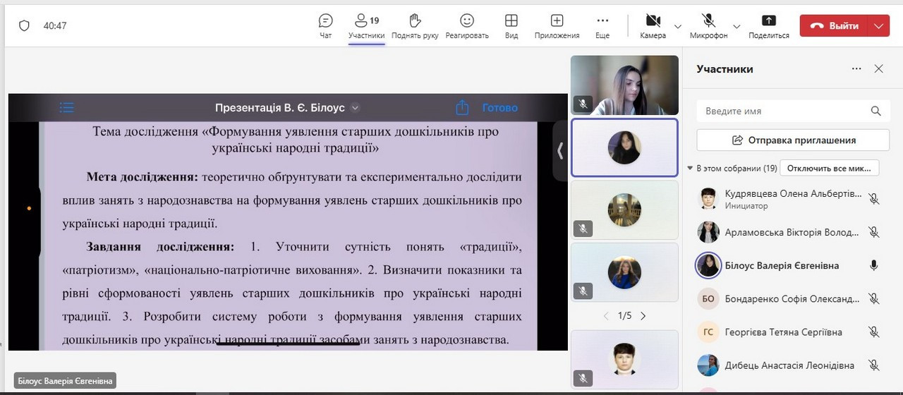Магістрантка 1 року навчання А. Л. Дибець презентувала результати дослідження на тему: «Розвиток фізичних якостей дітей старшого дошкільного віку під час ігор спортивного характеру». Студентка 2 року навчання, 2 групи В. Є. Білоус поділилася напрацюваннями з теми: «Формування уявлення старших дошкільників про українські народні традиції».