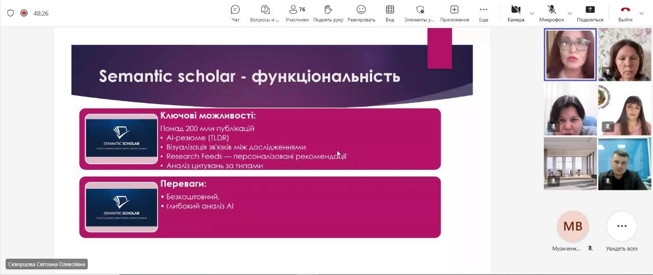 Світлана Скворцова ознайомила учасників із можливостями чат-ботів ChatGPT, Claude, Perplexity, а також спеціалізованих платформ Google Scholar, Semantic Scholar, Cite, Elecit для пошуку, аналізу та систематизації наукової інформації.
