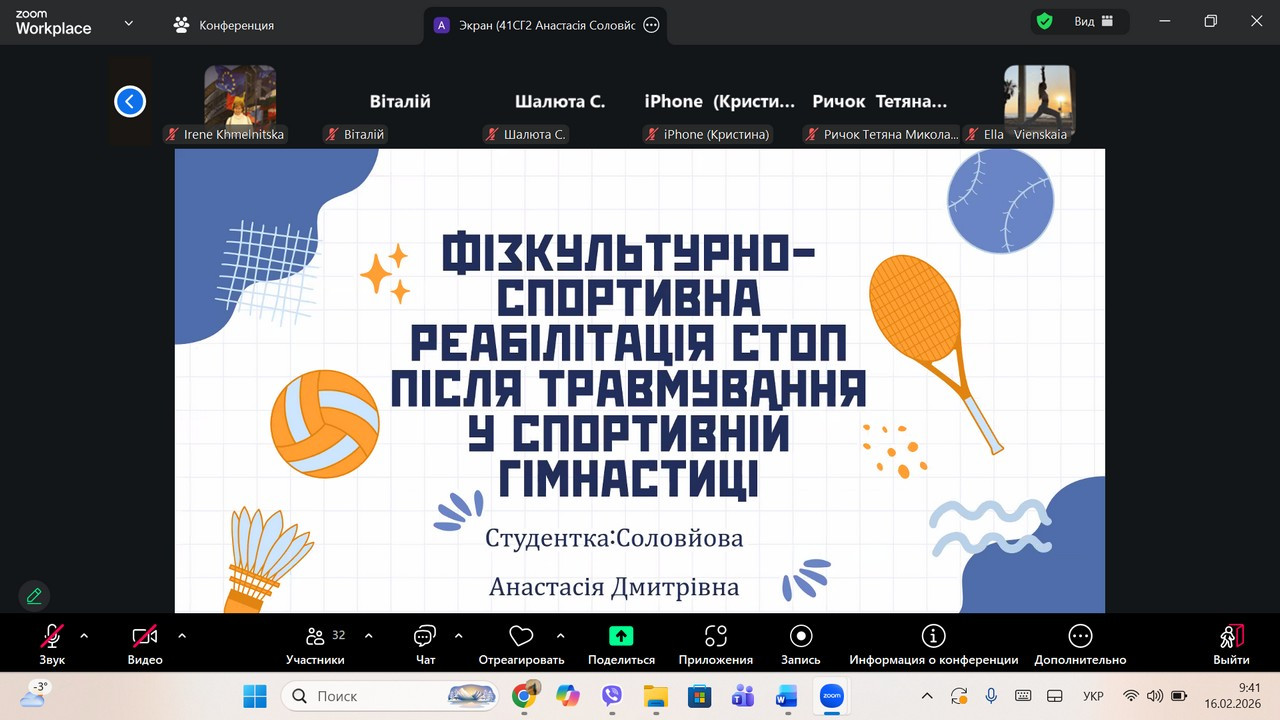 16 лютого 2026 року науковий керівник проблемної групи «Фізкультурно-спортивна реабілітація», д-р наук з фіз. виховання і спорту, доцент кафедри гімнастики та фізкультурно-спортивних технологій Буховець Божена та члени проблемної групи здобувачі другого (магістерського) рівня вищої освіти спеціальності А7 Фізична культура та спорт прийняли участь у науковій онлайн-платформі здобувачів вищої освіти кафедри кінезіології та фізкультурно-спортивної реабілітації Національного університету фізичного виховання і спорту України «Фізкультурно-спортивна реабілітація крізь призму сучасних дипломних досліджень».