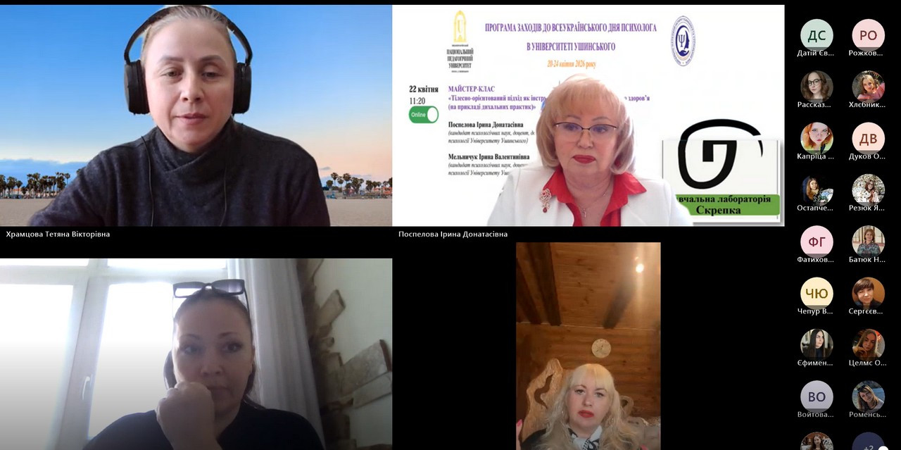 22 квітня доценти кафедри теорії та методики практичної психології Мельничук Ірина Валентинівна та Поспелова Ірина Донатасівна провели онлайн-майстер-клас на тему «Тілесно-орієнтований підхід як інструмент підтримки психологічного здоров’я (на прикладі дихальних практик)» на базі платформи навчальної лабораторії «СКРЕПКА», що присвячений Всеукраїнському дню психолога.