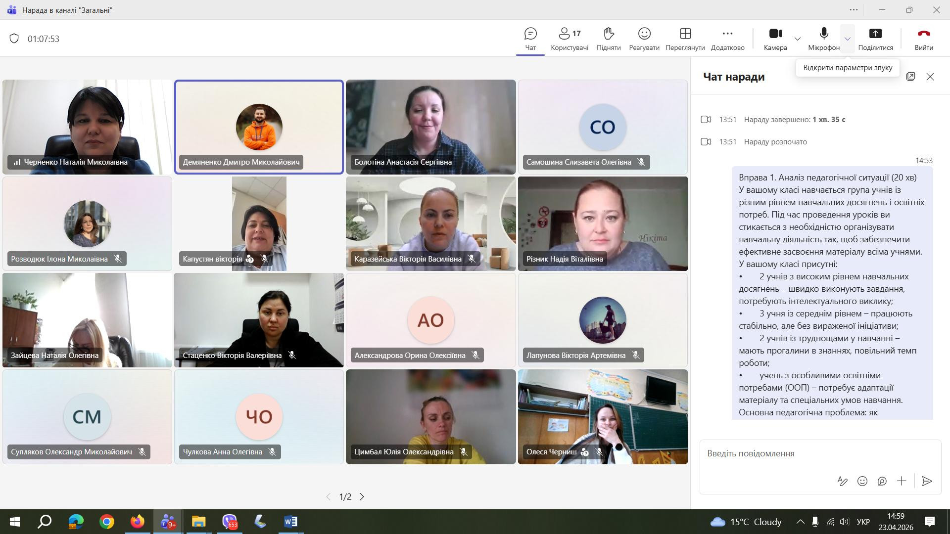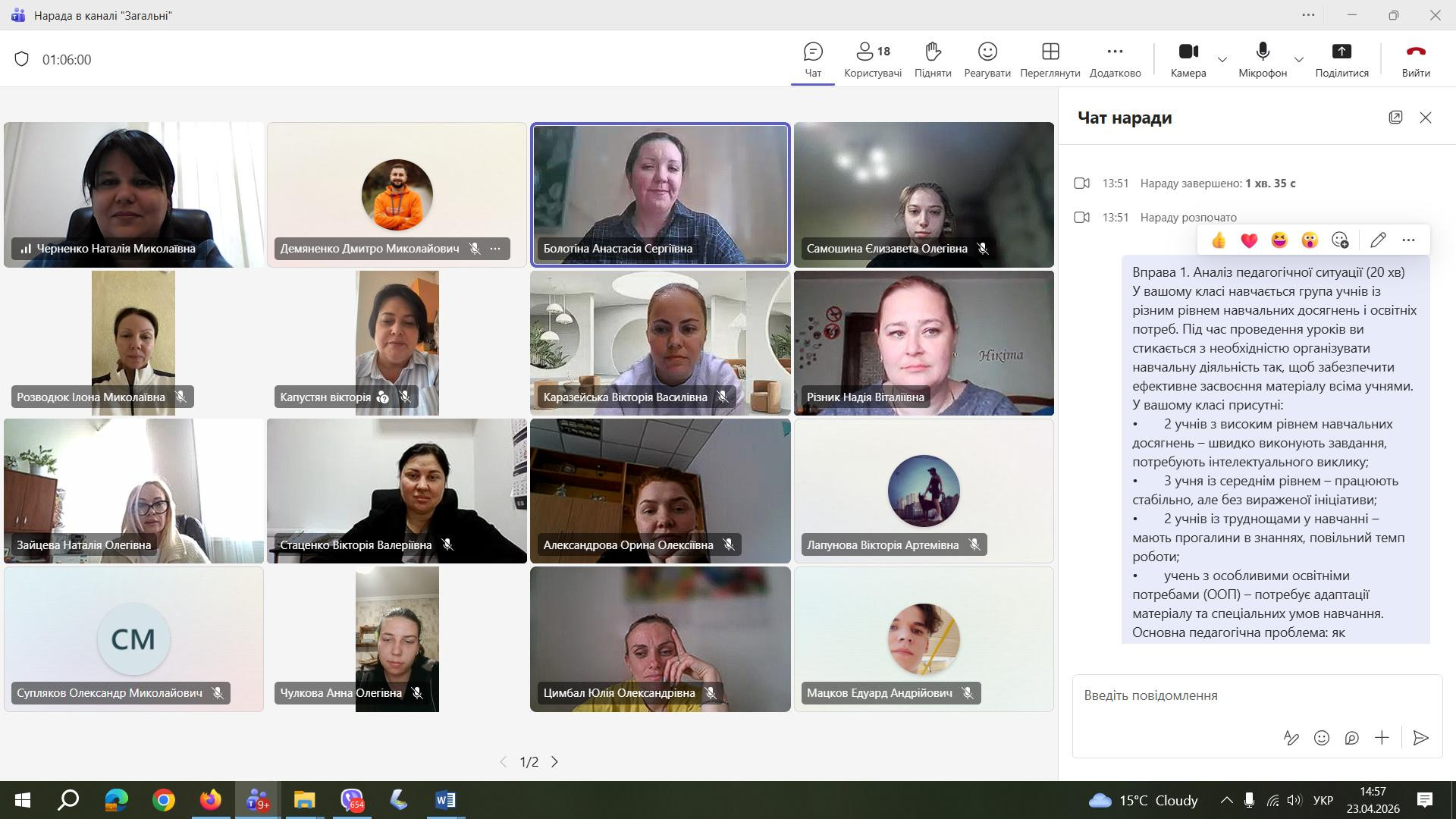 Практична частина заняття була насиченою та інтерактивною. Здобувачі працювали індивідуально, у парах і групах, виконуючи кейсові завдання. У межах аналізу педагогічних ситуацій вони визначали ефективні підходи до організації навчання для учнів із різним рівнем підготовки, включаючи учнів з особливими освітніми потребами. Під час розробки диференційованих завдань учасники створювали фрагменти уроків із урахуванням різних рівнів навчальних досягнень, що сприяло формуванню практичних навичок організації освітнього процесу.