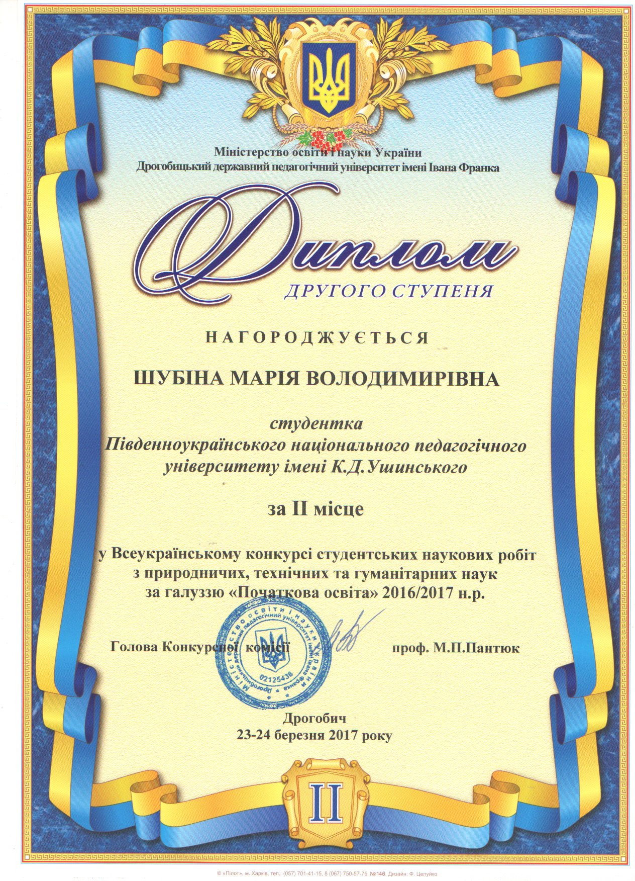 За результатами Конкурсу студентка V курсу факультету початкового навчання ПНПУ імені К.Д. Ушинського Шубіна Марія посіла ІІ місце.
