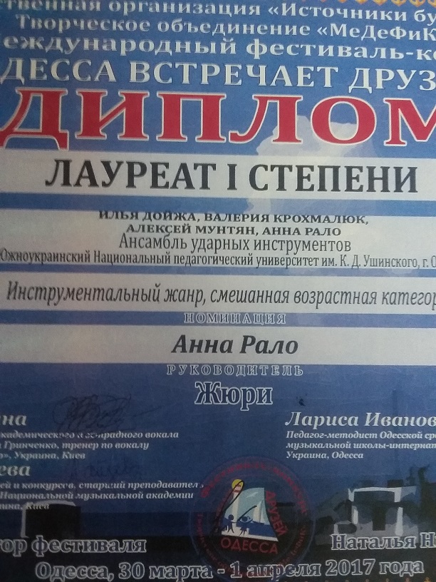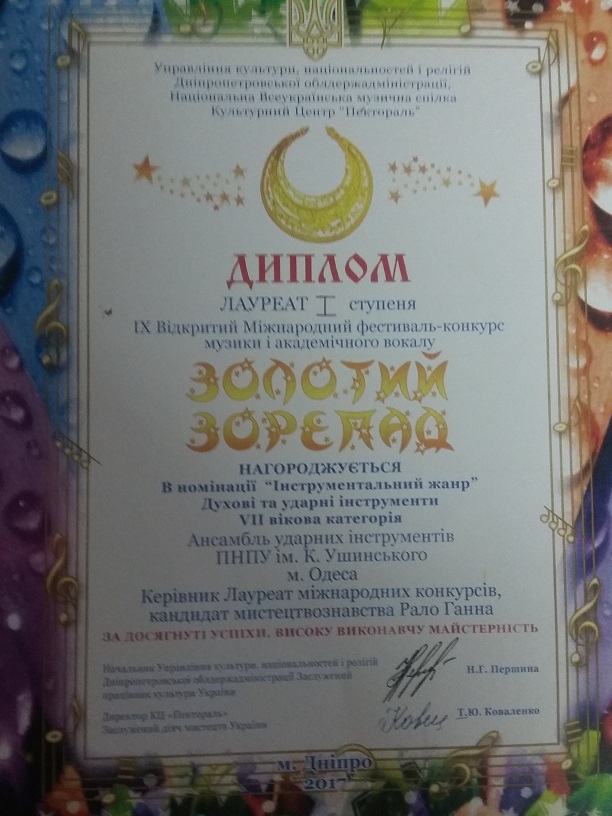 У IX Відкритому Міжнародному фестивалі-конкурсі музики «Золотий зорепад» ( м.Дніпропетровськ) звання лауреата І ступеню в номінації «Фортепіано» одержав магістрант факультету музичної та хореографічної освіти Олексій Вапняр (клас доцента Горожанкіної О.Ю.). Переможцями в номінації «Духові та ударні інструменти» стали студенти факультету музичної та хореографічної освіти - ансамбль ударних інструментів під керівництвом кандидата мистецтвознавства Рало Г.О., який також посів І місце у Міжнародному фестивалі-конкурсі «Одеса зустрічає друзів».