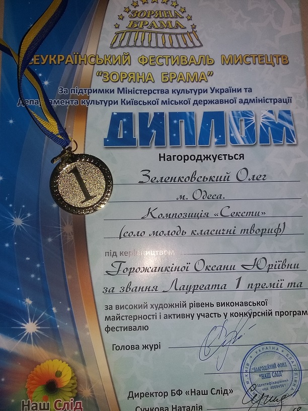 Вітаємо студентів факультету музичної та хореографічної освіти з перемогою у Всеукраїнському фестивалі мистецтв «Зоряна Брама», що пройшов в м. Київ 17 травня. В номінації «Інтрументальний жанр» лауреатом І премії став студент 4 курсу Зеленковський Олег (клас доцента Горожанкіної О.Ю.). Звання Лауреатів в номінації «Академічий спів» посіли Лі Ліцюань (І премія) та Фен Інін (ІІ премія), клас доцента Ройтенко Н.О., концертмейстер Тетяна Мажара.