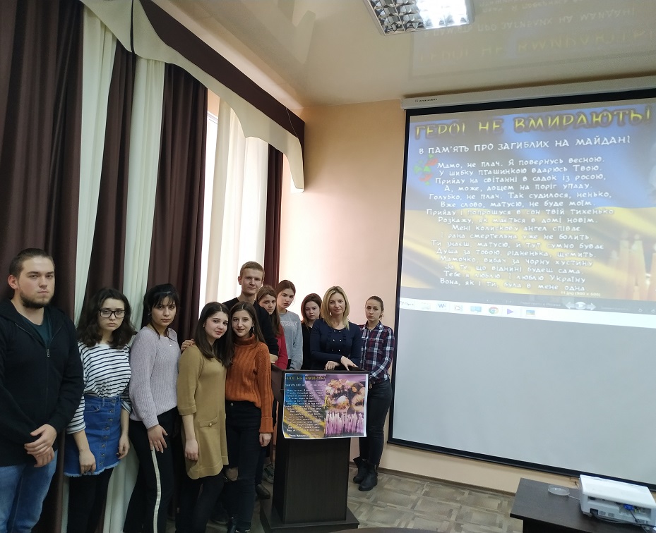 В рамках шанування 5 річниці Дня Героїв Небесної Сотні — 20 лютого (указ Президента України “Про вшанування подвигу учасників Революції Гідності та увічнення пам’яті Героїв Небесної Сотні”) відбувся відкритий захід “Герої не вмирають” старшого викладача кафедри політичних наук і права Пронози І. І. зі студентами першого року навчання спеціальності 052 “Політологія”. Метою заходу було виховання патріотичної свідомості майбутніх політологів, повага до національних інтересів України та її європейського вибору, прав і свобод людини та громадянина.