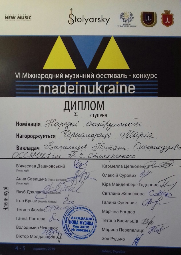 4-5 травня в Одеській середній спеціалізованій музичній школі-інтернаті ім. П.С.Столярського пройшов VI Міжнародний фестиваль-конкурс дитячої та юнацької творчості «MadeinUkraine».