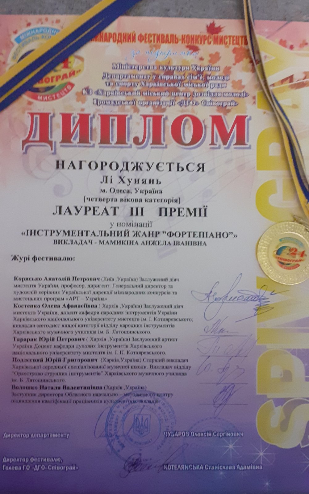 18 – 19 жовтня 2019 року за підтримки Міністерства культури України в місті Харків пройшов Міжнародний конкурс-фестиваль мистецтв «Співограй». Виступ учасників інструментальної номінації відбувся в Харківському музичному училище імені Б. Лятошинського і включав виконання двох різнохарактерних творів. Журі відзначило високий рівень професійної підготовки студенток 4 курсу факультету музичної та хореографічної освіти: перемогу та звання лауреату І ступеню одержала Тетяна Козлова (клас доцента Горожанкіної О.Ю.), ІІІ премію посіла Лі Хунянь (клас викладача Мамикіної А.І.).