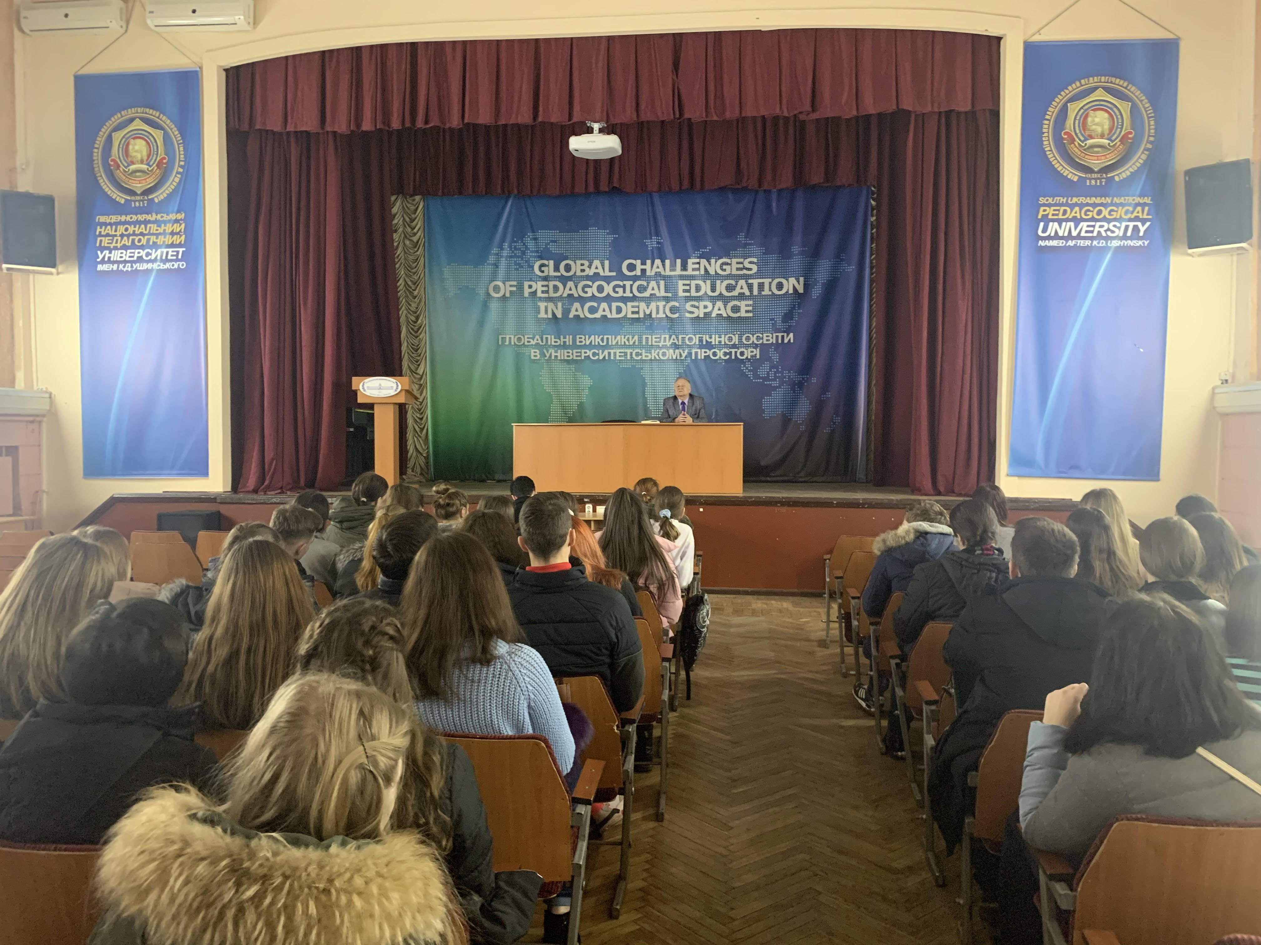 18 лютого 2020 року в межах заходів, передбачених проведенням Тижня доброчесності в Університеті Ушинського, відбулася зустріч студентів спеціальностей 052 Політологія та 081 Право всіх років навчання з представниками адміністрації вишу - ректором університету академіком Чебикіним Олексієм Яковичем та першим проректором з навчальної та науково-педагогічної роботи професором Копусь Ольгою Антонівною.