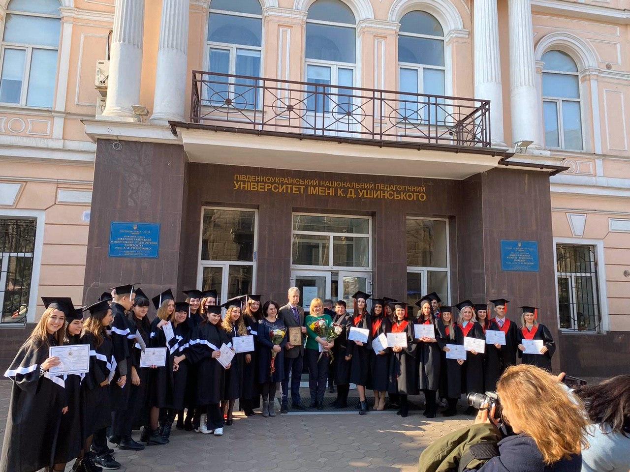 Дипломи випускникам кафедри освітнього менеджменту та публічного управління Університету Ушинського вручили перший проректор Копусь О. А. та завідувач кафедри Долженков О.О.