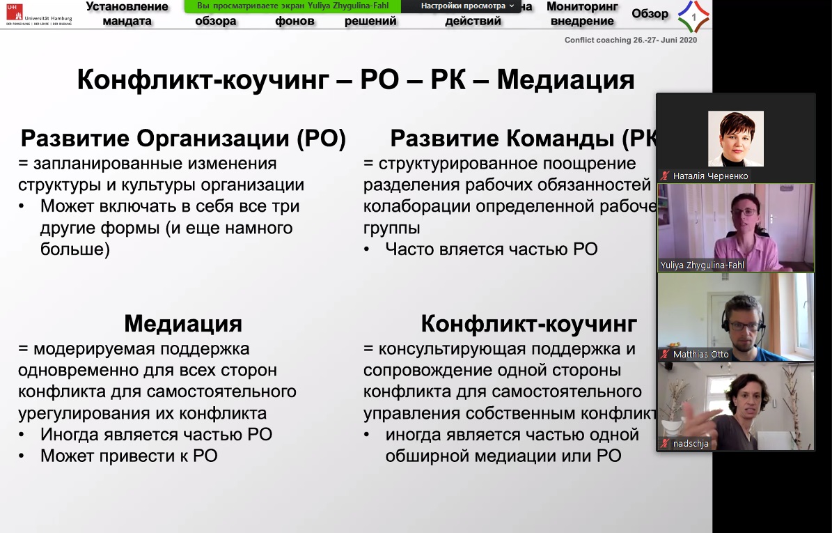 Одночасно в Online-Воркшопі взяли участь медіатори, експерти, учені з Німеччини, України, Молдови, Киргизстану, Азербайджану. У міжнародному колі також були обговорені проблемні питання щодо застосування методів та прийомів медіативного конфліктного коучінгу в системі навчання здобувачів магістратури, впровадження в роботу Бюро медіацій нової послуги – конфліктний коучінг.