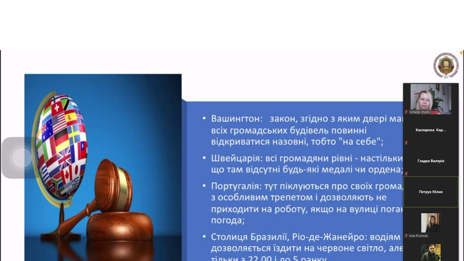 Традиційно 10 грудня в усьому світі відзначається День прав людини. Викладачі кафедри політичних наук і права, студенти спеціальностей 081 Право та 052 Політологія Південноукраїнського національного педагогічного університету імені К. Д. Ушинського вже не в перший раз долучаються до цього свята. Цього року кафедрою був організований круглий стіл "Я маю право!", на якому студенти представили презентації з питань захисту прав людини в Україні та світі.