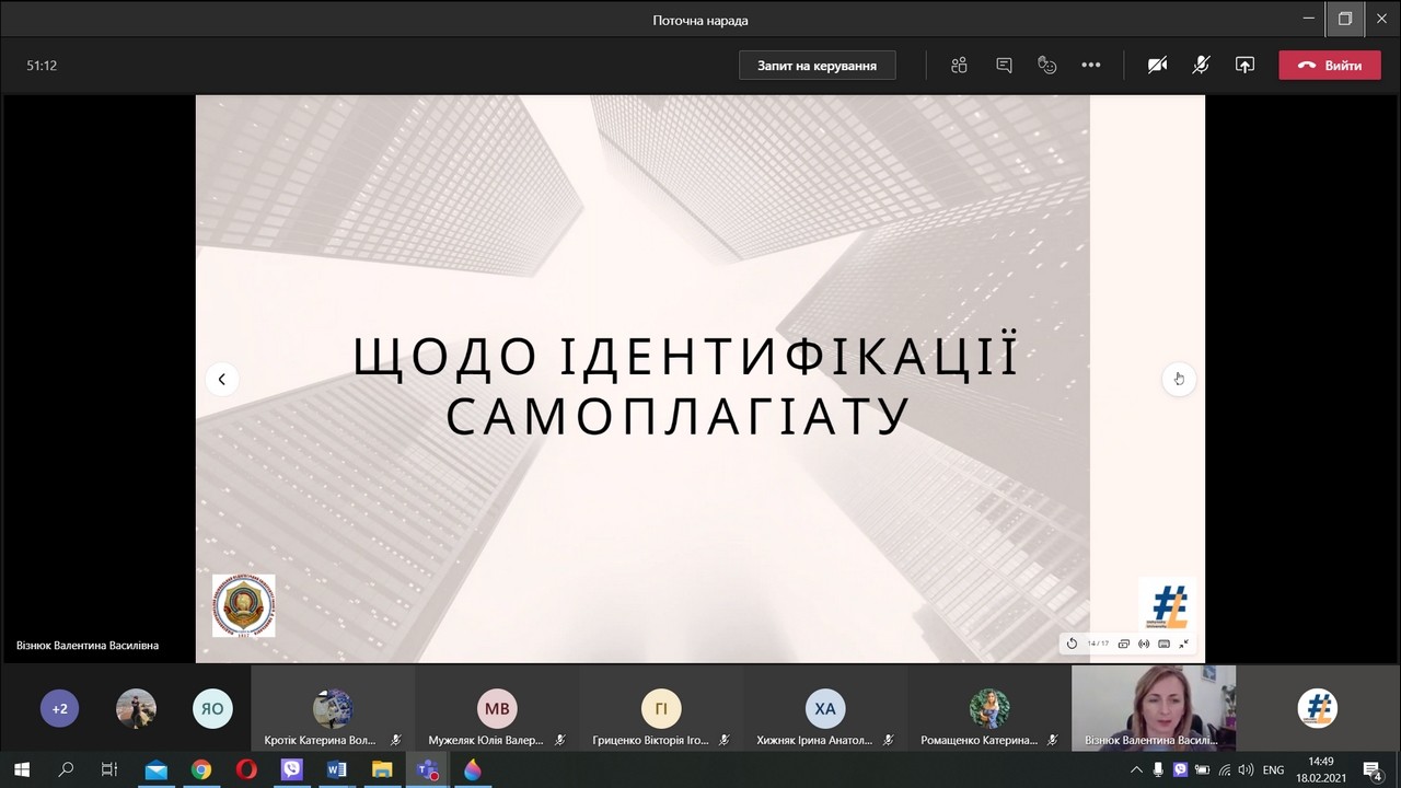 Під час воркшопу «Запобігання академічного плагіату в дослідницькій роботі, практичні поради», який провели директорка бібліотеки Валентина Візнюк та заступниця директорки Олена Спасскова, здобувачи третього (освітньо-наукового) рівня вищої освіти дізналися про особливості технічної перевірки письмових робіт на ознаки плагіату програмою Strikeplagiarism, ідентифікацію плагіату і самоплагіату, особливості покликання тощо.