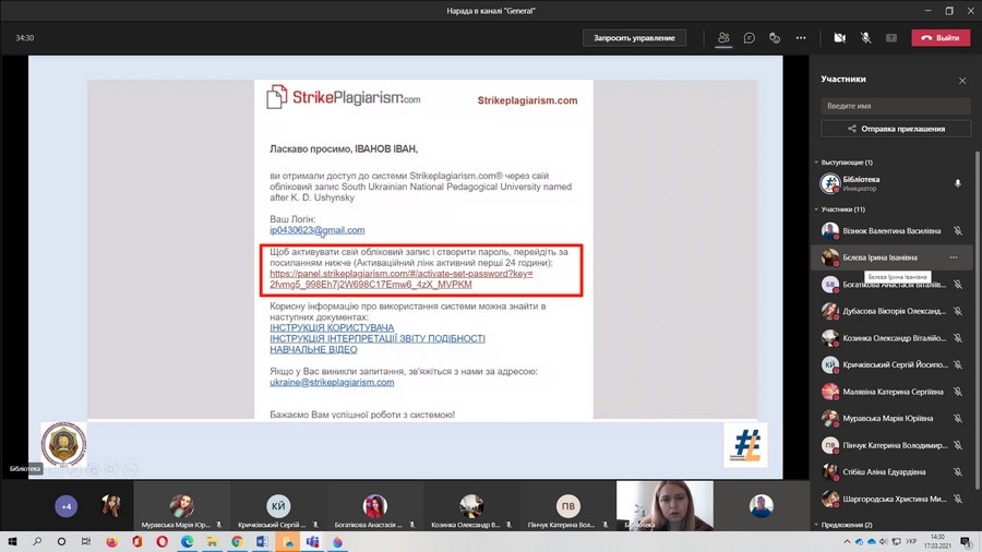 17 березня 2021 року бібліотека Державного закладу «Південноукраїнський національний педагогічний університет імені К. Д. Ушинського» провела онлайн-воркшоп для магістрантів з теми «Cntr-C + Cntr-V – магістрант у групі ризику».