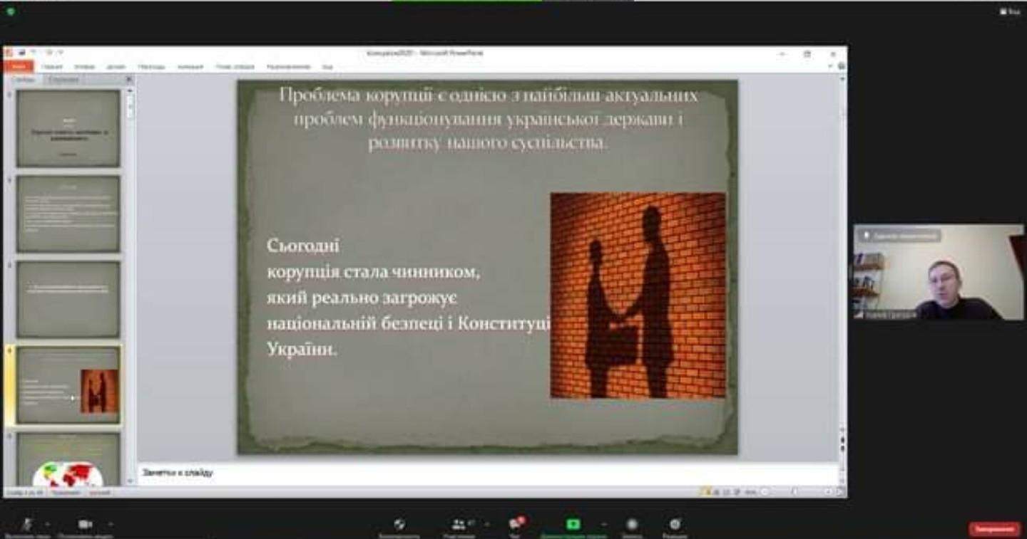 19 квітня 2021 року, в межах дисципліни «Запобігання корупції в публічному управлінні», кафедрою освітнього менеджменту та публічного управління Університету Ушинського було проведено бінарне заняття з кандидатом юридичних наук, доцентом кафедри кримінально-правової політики та кримінального права Інституту права КНУ імені Т. Шевченка УСАТИМ Григорієм Олександровичем для студентів спеціальності 281 «Публічне управління та адміністрування». Проведення заняття «Антикорупційна стратегія України: сучасні виклики, новели законодавства та тенденції розвитку» сприяло формуванню та розвитку управлінської компетентності у сфері запобігання та боротьби з корупцією майбутніх публічних управлінців, розкриттю різних аспектів антикорупційної діяльності в Україні, зокрема були порушені проблеми психологічного сприйняття корупції населенням, схильності до корупції, ролі держави в попередженні та провокуванні корупційних ризиків, кризи довіри до органів влади та багато інших.