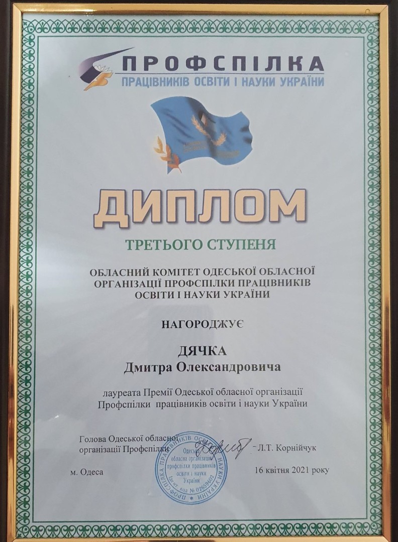 У травні 2021 року викладач кафедри інноваційних технологій та методики викладання природничих дисциплін Університету Ушинського, кандидат фізико-математичних наук Дячок Дмитро Олександрович отримав диплом третього ступеня як лауреат Премії Одеської області організації профспілки працівників освіти і науки України. Водночас Дмитро Олександрович став переможцем конкурсного відбору Південноукраїнського національного педагогічного універистету імені К. Д. Ушинського в номінації «Кращий молодий учений року» за результатами наукової роботи в 2020/2021 навчальному році.
