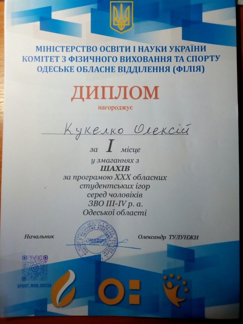 30.09.21. Пройшла першість вищих навчальних закладів міста Одеси з шахів. У змаганнях прийняли участь 12 команд. В особистому заліку перше місце зайняв студент 2 курсу Університету Ушинського Кукелко Олексій, який не програв жодної партії. Також підбивалися підсумки виступів між учасниками, що грали на 1 і 2 - дошці, тут наші спортсмени посіли 2 - місце. Збірна Університету Ушинського в загальному заліку команд посіла 4 місце.