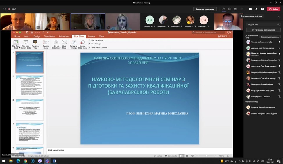 10 лютого 2022 року на платформі Office 365 відбувся науково-методичний семінар для здобувачів освіти 3 та 4 років навчання бакалаврату спеціальності 281 «Публічне управління та адміністрування» на тему «Як підготувати та захистити кваліфікаційну (бакалаврську) роботу».