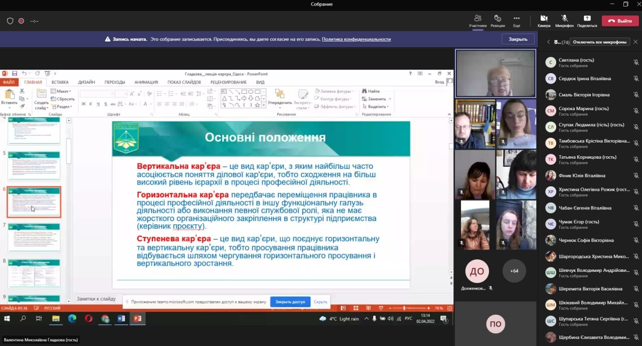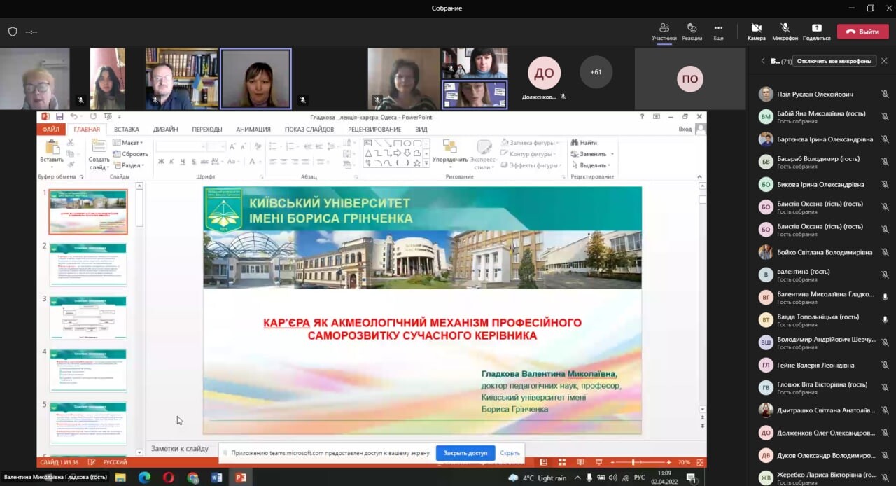 2 квітня 2022 року здобувачі вищої освіти спеціальності 033 «Філософія» долучилися до онлайн-семінару «Кар’єра як акмеологічний механізм професійного саморозвитку сучасного керівника» в рамках навчальної дисципліни «Управління персоналом» (доцент Сакалюк О. О.).