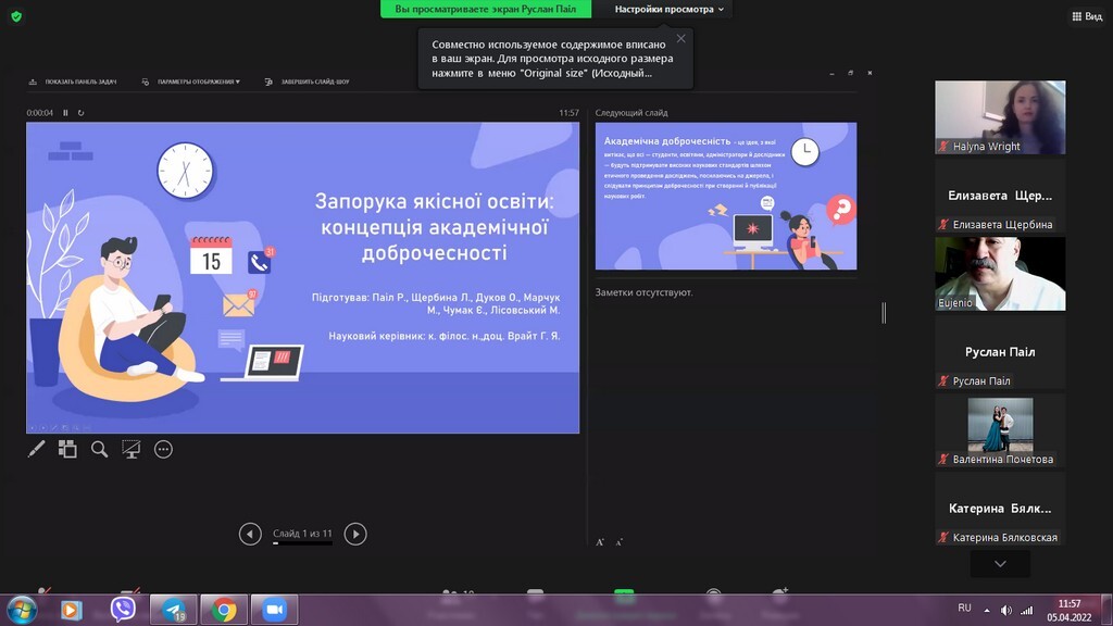 В обговоренні активну участь взяли аспіранти кафедри Елеонора Бутенко, Іванна Ніколаєва та інші. Вони відмітили особливості академічної доброчесності при написанні наукових робіт. Викладачі кафедри пояснювали особливості академічної доброчесності в спеціальностях, що представлені на кафедрі.