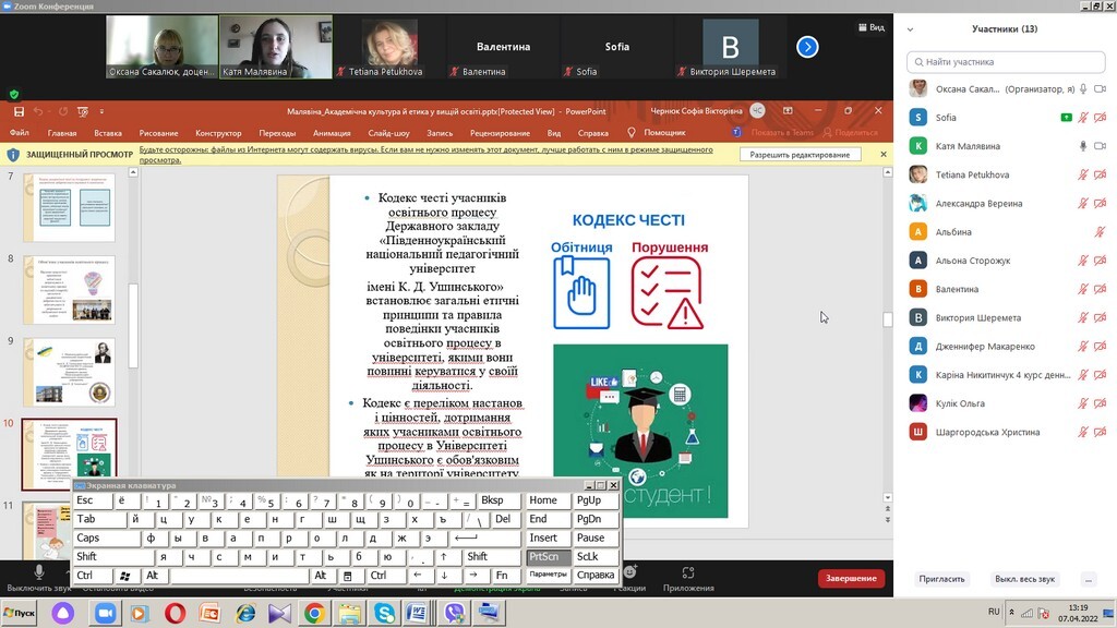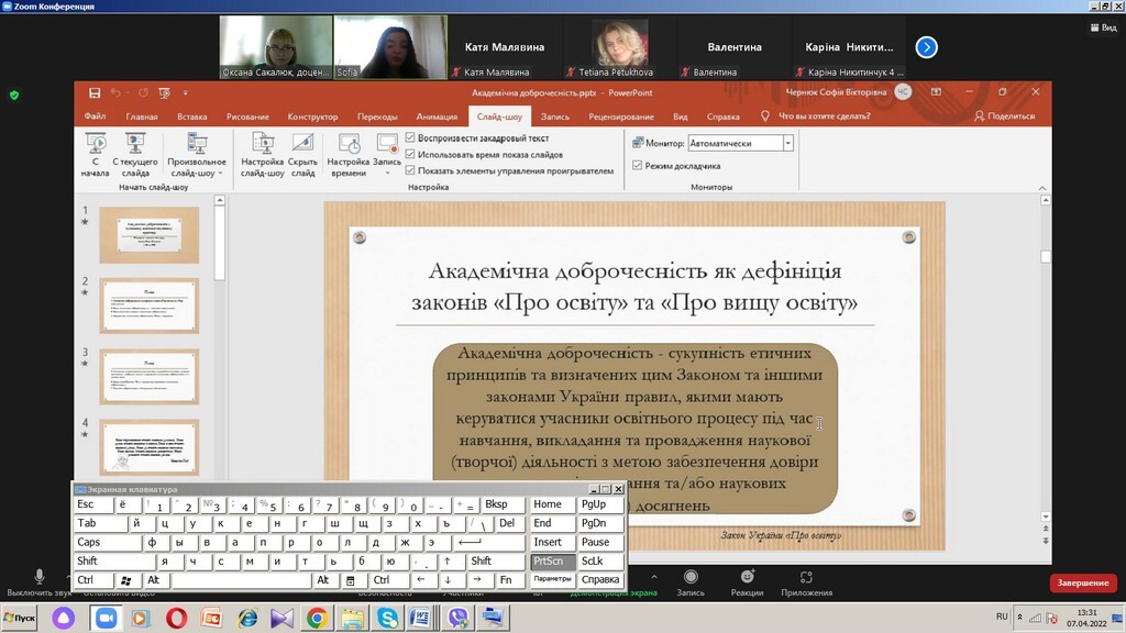 До обговорення актуальних питань академічної культури й етики у вищій освіті, академічної доброчесності в сучасному освітньо-науковому просторі, політики запобігання плагіату долучилися студенти спеціальності 281 «Публічне управління та адміністрування», магістри спеціальності 073 «Менеджмент». В обговоренні взяли участь також здобувачі освіти спеціальностей 014 Середня освіта (Трудове навчання та технології), 014 Середня освіта (Образотворче мистецтво), 015 Професійна освіта (Дизайн), 023 Образотворче мистецтво, декоративне мистецтво, реставрація художньо-графічного факультету Університету Ушинського.