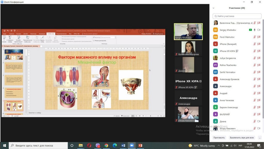 17 травня 2022 року в рамках підвищення кваліфікації для тренерів першої та другої категорії на базі Південноукраїнського центру професійного розвитку керівників та фахівців соціономічної сфери за підтримки Управління фізичної культури і спорту Одеської обласної державної адміністрації та кафедри гімнастики та спортивних єдиноборств Університету Ушинського відбулося заняття за темою «Сучасні технології спортивного масажу», спікер: кандидат педагогічних наук, доцент, приват-професор кафедри біології і охорони здоров’я Холодов Сергій Анатолійович.