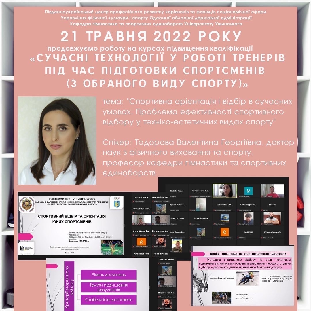 21 травня 2022 року на базі Південноукраїнського центру професійного розвитку керівників та фахівців соціономічної сфери за підтримки Управління фізичної культури і спорту Одеської обласної державної адміністрації та кафедри гімнастики та спортивних єдиноборств Університету Ушинського продовжили свою роботу курси підвищення кваліфікації для тренерів першої та другої категоріії «Сучасні технології у роботі тренерів під час підготовки спортсменів (з обраного виду спорту)».