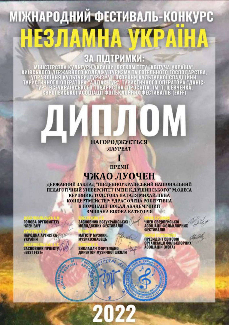 Вітаємо з перемогою на Міжнародному фестивалі–конкурсі «Незламна Україна» (м. Київ) у номінації «Вокал академічний» магістрантів факультету музичної та хореографічної освіти Чжан Чжаофена і Чжао Луочена, яких підготували старший викладач кафедри теорії музики і вокалу Наталія Толстова і концертмейстера Удрас О. !
