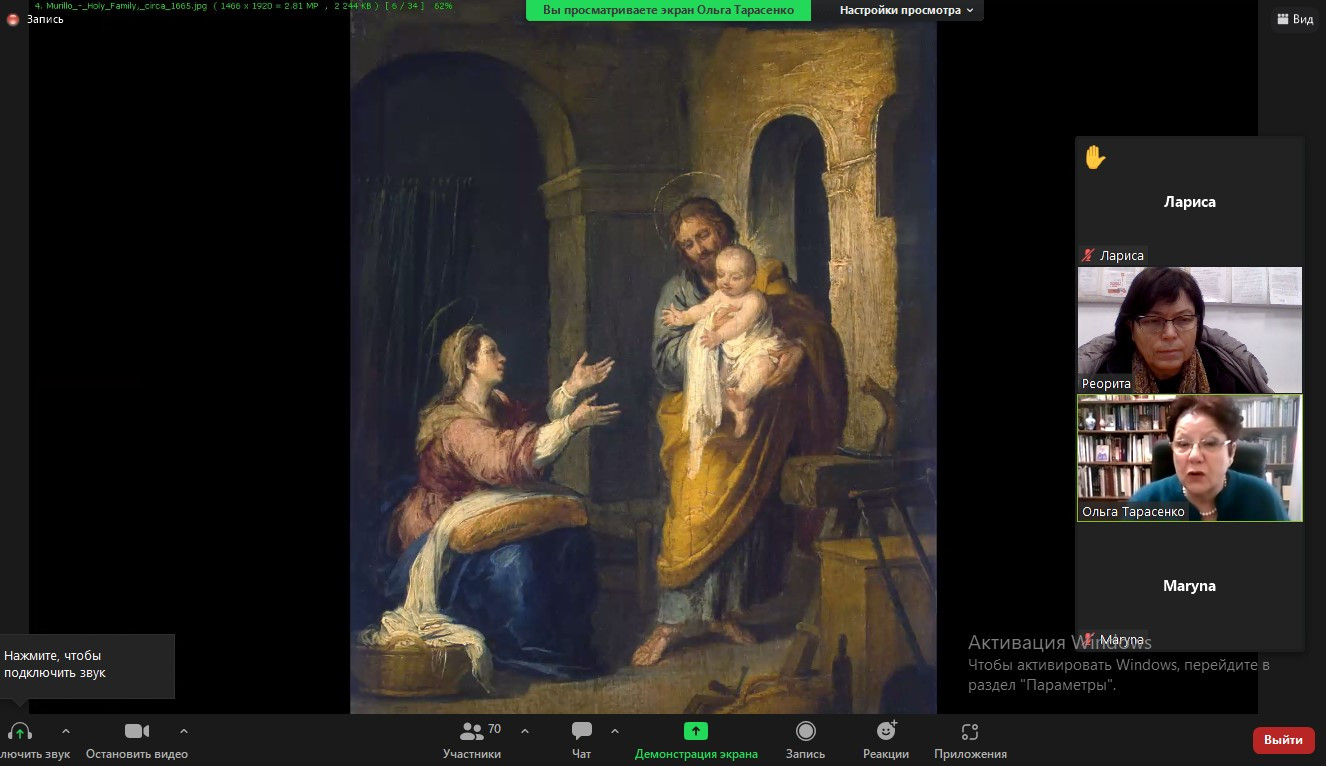 Голова Наукової школи артсинергетики доктор мистецтвознавства, професор Ольга Андріївна Тарасенко презентувала особливо важливу для сьогодення життєстверджуючу тему родини, розкривши її символічний змістовний контекст на прикладі картини Тараса Шевченка «Селянська родина».