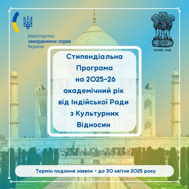 До Міністерства закордонних справ України звернулося ПосольствоРеспубліки Індія в Україні з проханням оприлюднити серед українських закладів вищої освіти інформацію про оголошену Індійською Радою з Культурних Відносин Стипендіальну Програму на 2025-26 академічний рік.