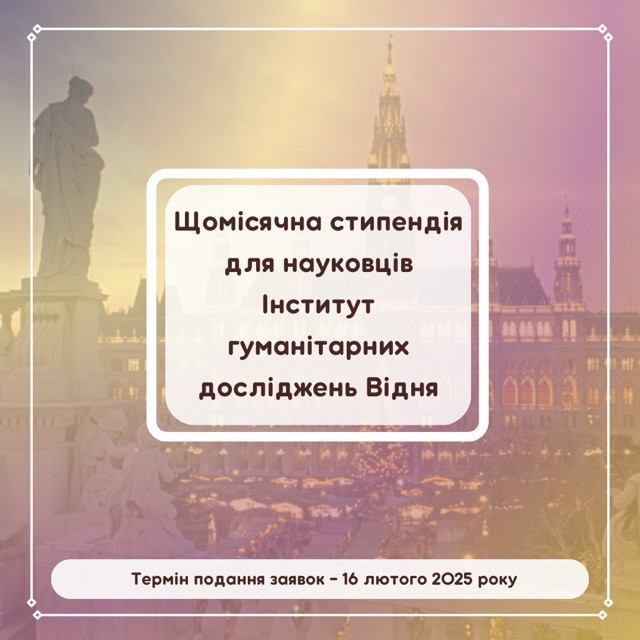 Щомісячну стипендію, яка покриє усі витрати на час перебування у Відні. 2750 євро якщо ви ще навчаєтеся та 3300 євро — якщо вже захистили дисертацію. Можливість чотири місяці працювати над своєю науковою роботою в Інституті гуманітарних досліджень Відня — з вересня 2025 року по червень 2026 року.