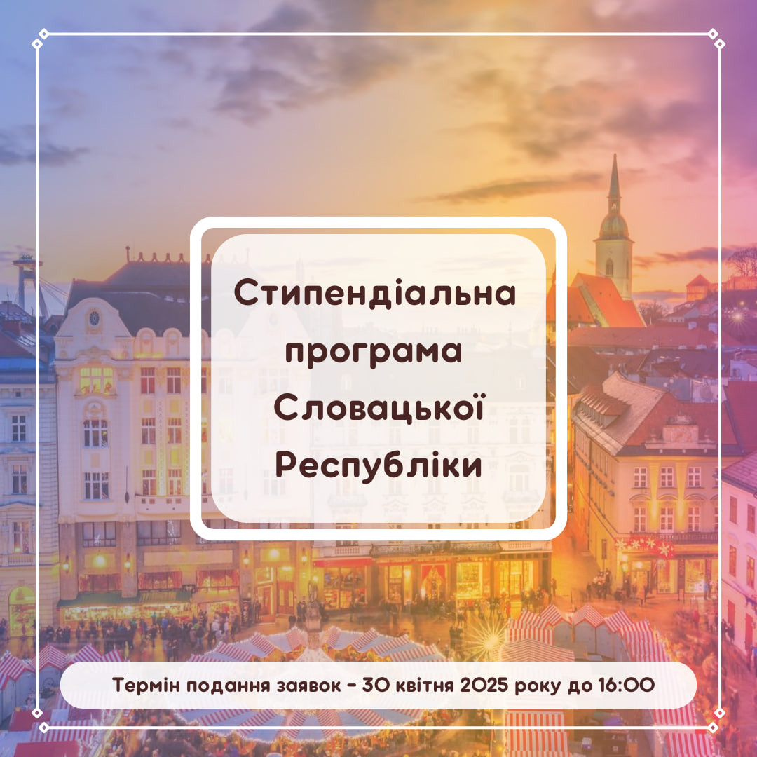 Посольство Словацької Республіки в Україні, отриманою нотою від 20.03.2025 VN 15037 / 2025 - UAVV (додається), Національною стипендіальною програмою Словацької Республіки (NŠP) оголошено про новий прийом заявок на навчання, дослідницьке, мистецьке та лекційне стажування у Словаччині в 2025/2026 академічному році.