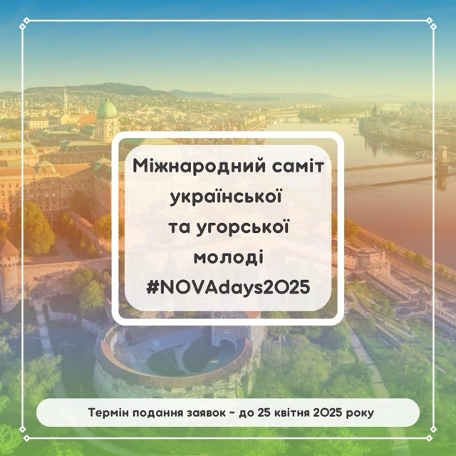 Доводимо до вашого відома, що 10-11 травня в м. Будапешт (Угорщина), за співорганізації Експертної ради студентства закладів вищої освіти, відбудеться Міжнародний саміт української та угорської молоді «#NOVAdays2025», ініційований Речницею української національної меншини в Парламенті Угорщини Ліліаною Грексою.